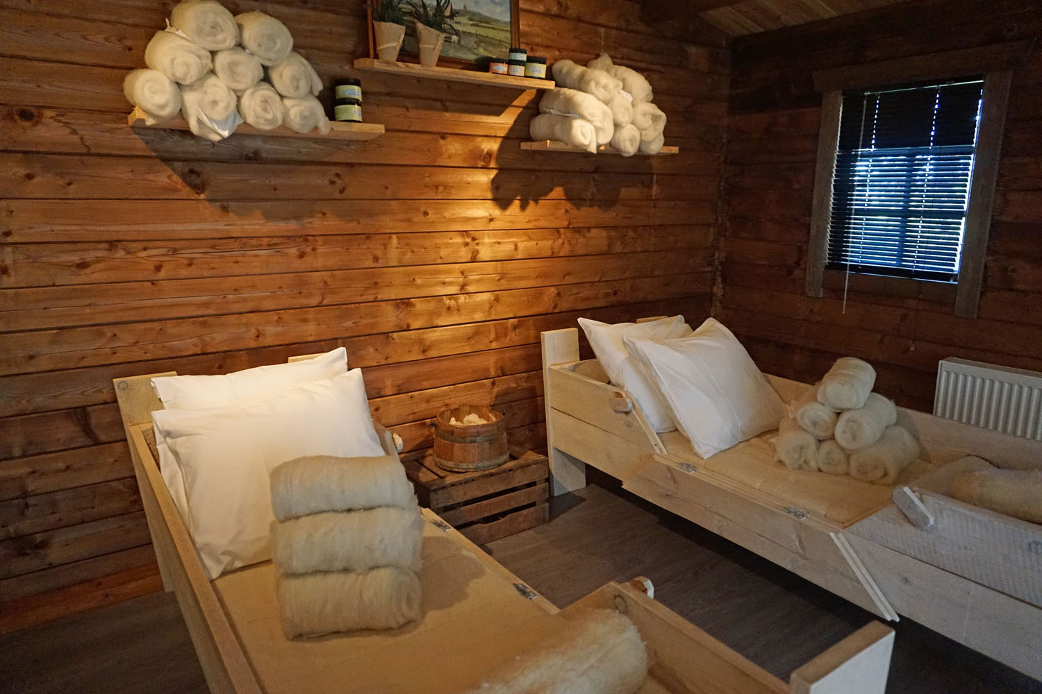 - Woolness: Wellness kann jeder – im Boutique Hotel Texel gibt es jedoch Entspannung in Wolle. Dabei lässt man sich in einer Holzhütte hinter dem Hauptgebäude in Schafswollstreifen einwickeln, und zwar von den Füßen bis zum Hals. Das kratzt weniger, als man denkt, und eine heilende Wirkung für schmerzende Muskeln und Knochen soll es außerdem haben. So eingepackt ruht man bei klassischer Musik während die Äste der umstehenden Bäume ein Schattenspiel auf die Jalousien zaubern. Die Wolle wird übrigens nach der Benutzung gewaschen und zum Stricken benutzt.