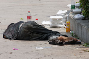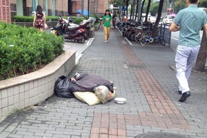 - Es wird viel und hartnäckig gebettelt. Manchmal wird man dabei berührt, oder der Bettelnde kniet sich nieder. Weniger aufdringlich war in Shanghai ein alter Mann, klein, nur Haut und Knochen, der ein Brett auf Rädern durch eine schmale Gasse schob. Darauf lag ein jüngerer Mann ohne Füße, bewegungslos, apathischer Gesichtsausdruck. Auf dem Brett stand außerdem eine Metallschüssel, in die Passanten Kleingeld warfen, sowie ein Radio, aus dem leise fernöstliche Musik kam. Einige Straßen weiter lag eine alte Frau auf dem Bauch auf dem Bürgersteig, Arme und Beine merkwürdig abgewinkelt, den Kopf auf einen gefüllten Sack gelegt. Ich bin ziemlich sicher, dass sie dort nicht alleine hinkam, und frage mich, wer sie dort abgelegt hat. Nach der Mittagspause sieht man neben Bettlern übrigens oft Türme aus Styroporboxen: Die Angestellten der großen Banken und Firmen lassen sich die Reste ihres Mittagsessens einpacken und stellen es dann häufig bei den Bedürftigen ab. Einer meiner Tipps für China: Hast du etwas übrig, stell’s dazu.