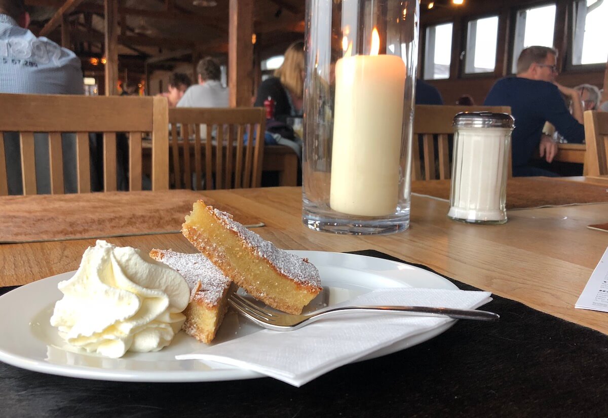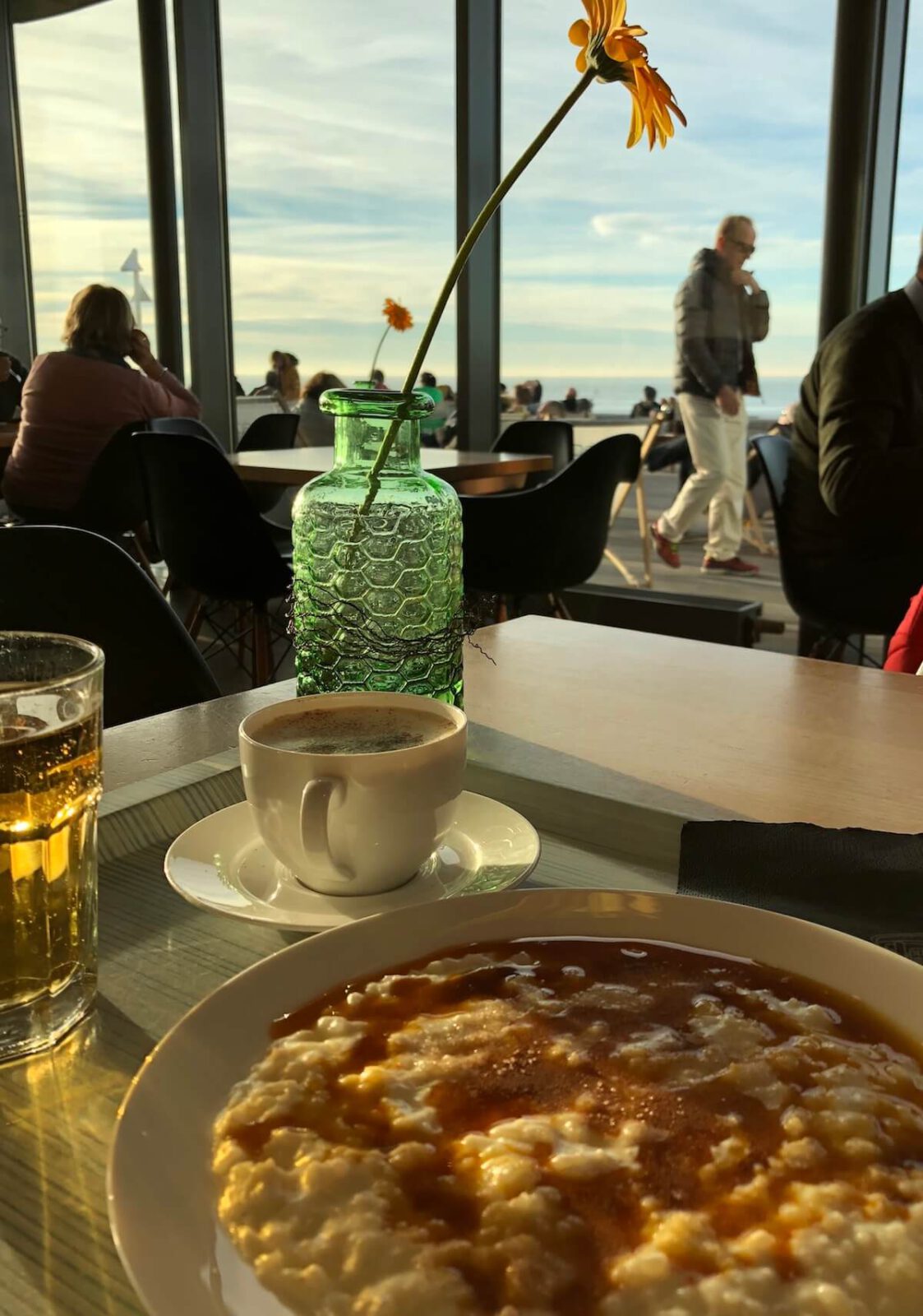 - Marienhöhe. Liegt auf einem kleinen Hügel und ist rund. Darum hat man auch quasi einen Rundumblick aufs Wasser durch die großen Fenster mit den weißen Sprossen. Die Tische sind in vier Kreisen angeordnet, die nach innen immer kleiner werden. Selbst im innersten hat man aber noch den Blick aufs Meer. Hier habe ich mich über Aprikosen-Sanddorn-Torte und einen Sanddorn-Grog mit Rum gefreut.