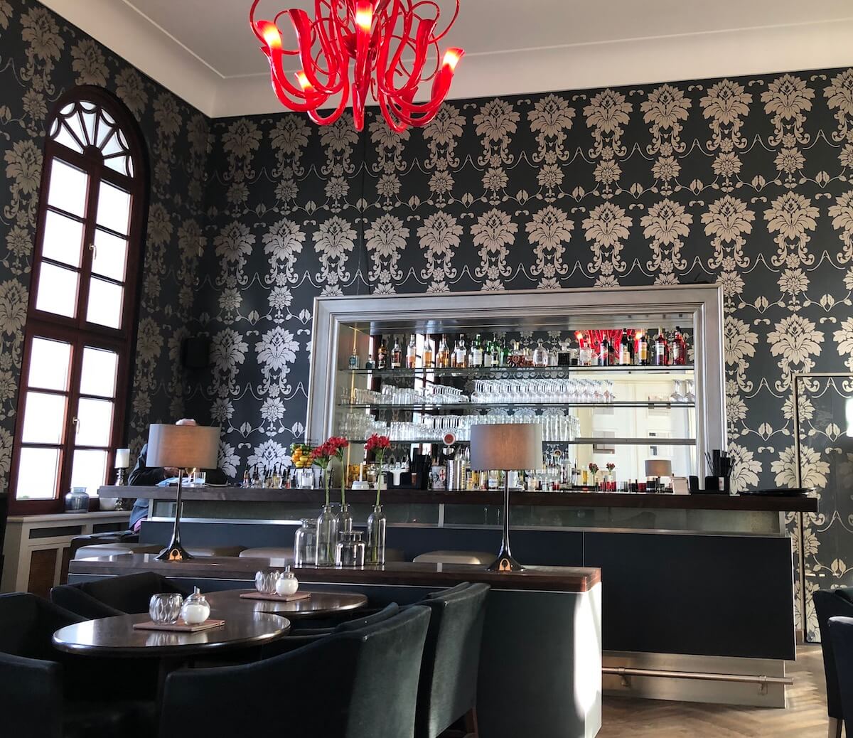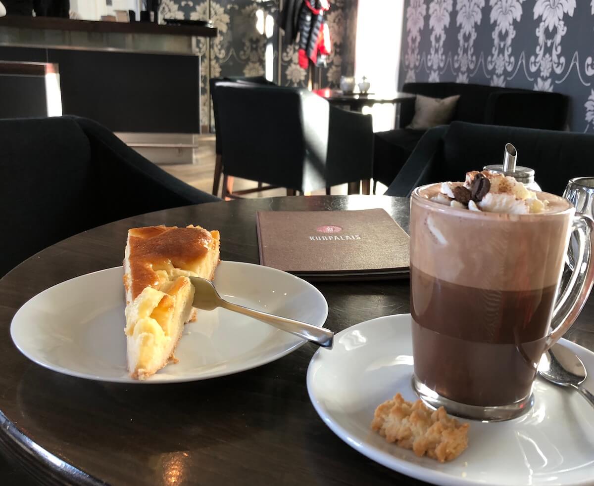 - Kurpalais im Conversationshaus. Das Café sieht ziemlich stylish aus mit den dunklen Tapeten. Als ich am Sonntagmittag dort bin, ist es angenehm leer. Am Samstagnachmittag dagegen hatte ich keinen Tisch bekommen. Ich trinke dort einen Chocochino. Das ist ein Kakao mit Espresso und Sahne. Außerdem esse ich Apfelkuchen. An der Kuchentheke fällt mir das charmante Schild auf: