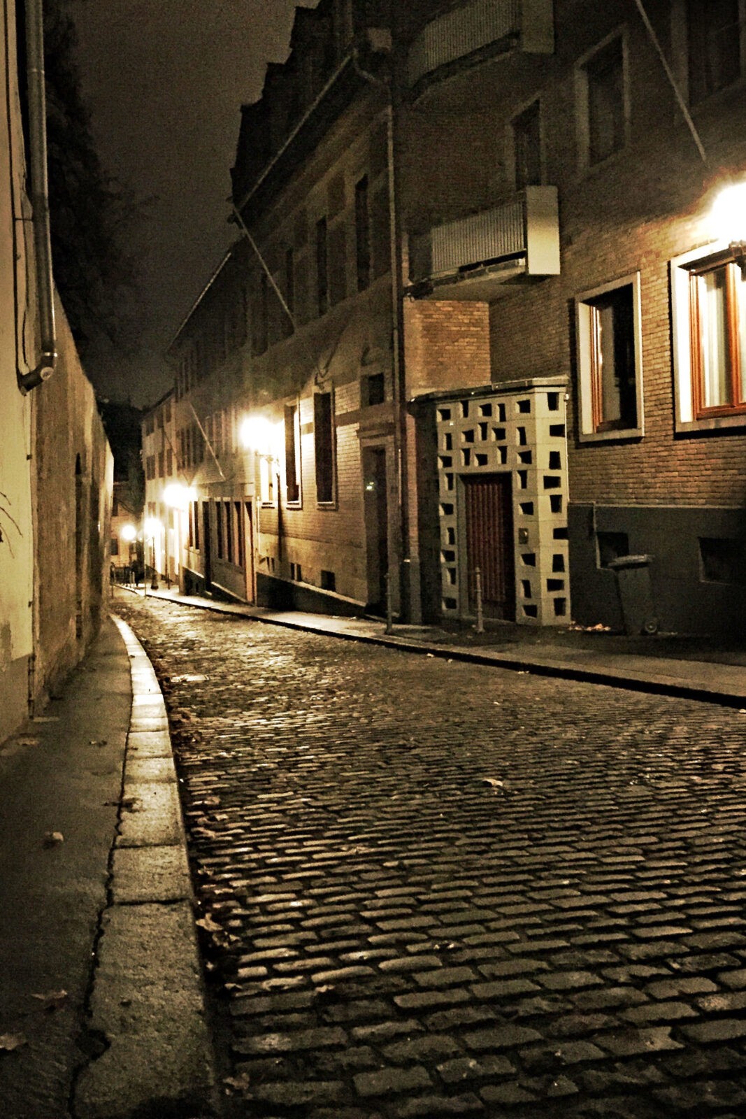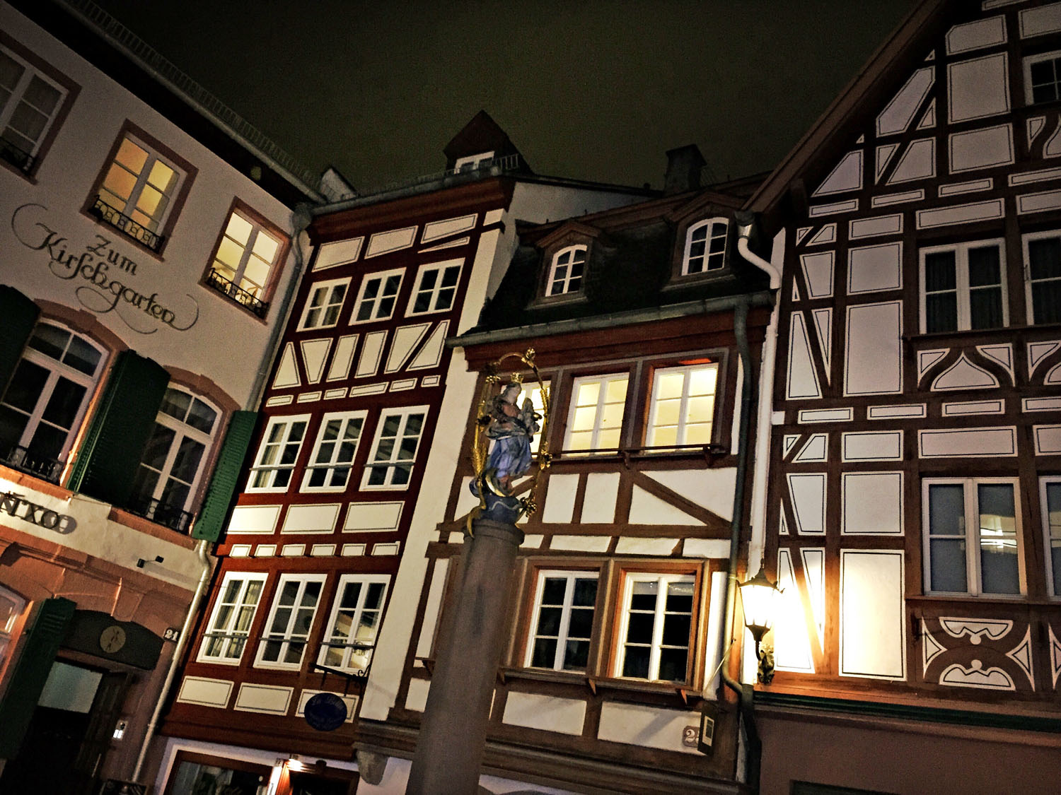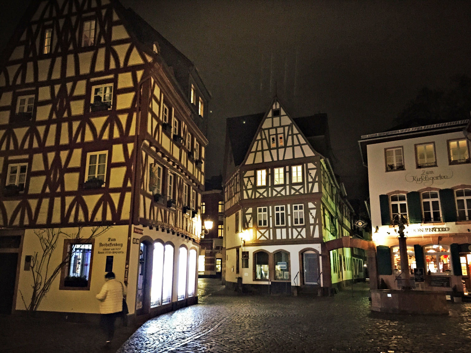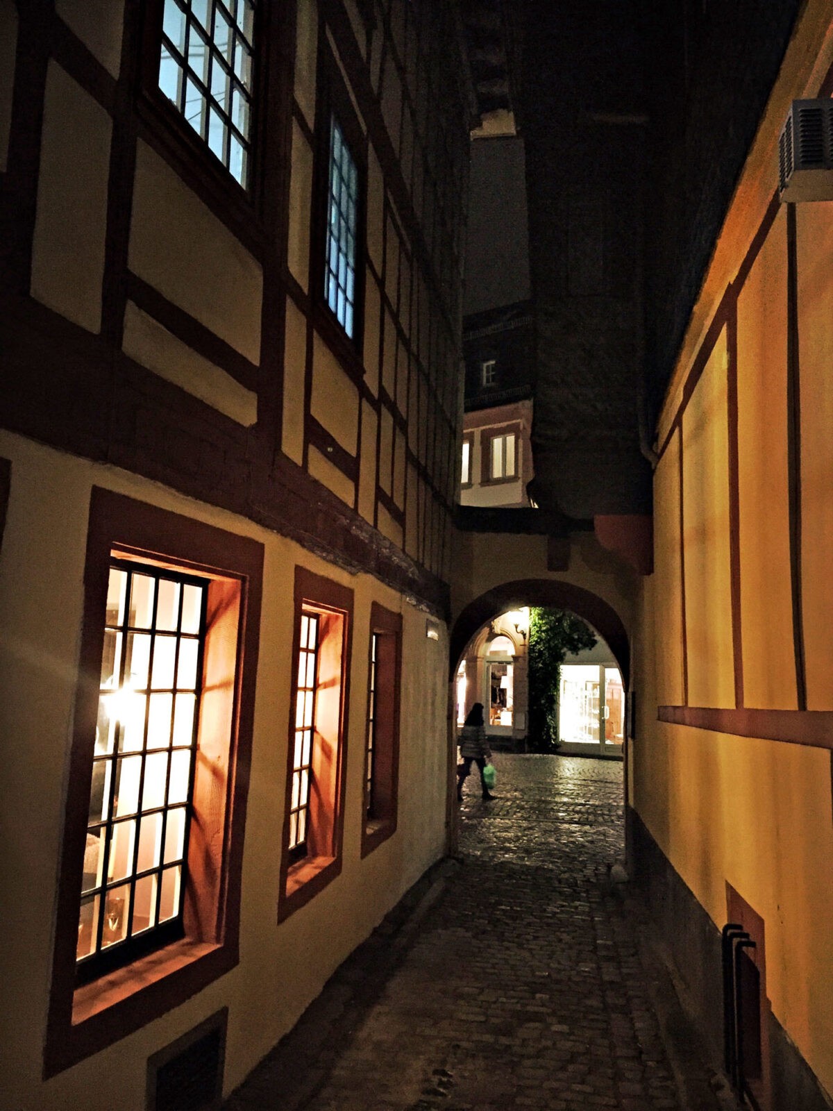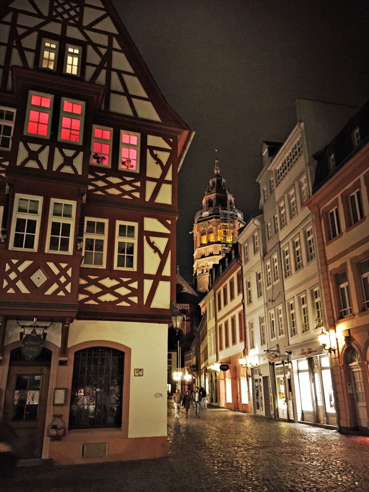Die Temperatur liegt nur knapp über null Grad. Es hat den ganzen Tag geregnet, die Straßen glänzen im Licht der Laternen. Es ist gar nicht so spät, doch es ist Winter und früh dunkel. Ich könnte den Abend im Hotel verbringen, dort ist es warm, und vielleicht käme ein interessanter Film im Fernsehen. Aber nachdem ich den ganzen Tag in einer Fortbildung gesessen habe, möchte ich mich bewegen. Darum mache ich einen Abendspaziergang durch Mainz. Denn ich finde, man sollte Geschäftsreisen immer mit einem kleinen touristischen Highlight verbinden.