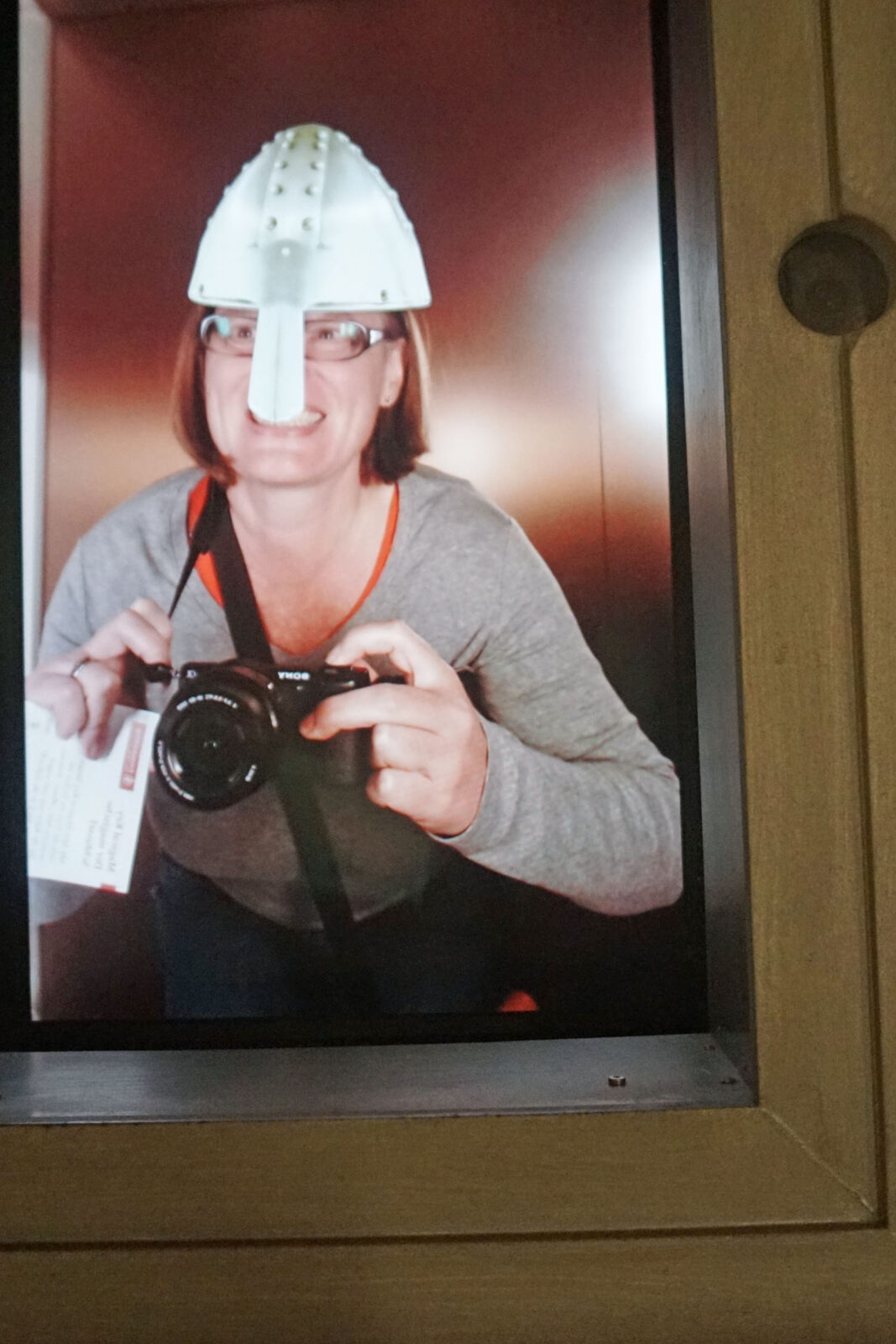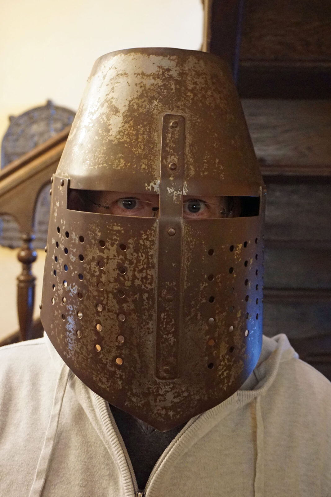 Auch das Burgmuseum ist ganz modern gestaltet und verbindet Historisches mit der Gegenwart. So wird zum Beispiel anhand von Ausstellungsgegenständen erklärt, woher Redewendungen wie „unter die Haube kommen“ und „den Löffel abgeben“ kommen. Außerdem kann man einen echten Ritterhelm aufziehen – man sieht nicht viel durch die Schlitze. Auch Luft bekam ich nicht so gut. Aber eigentlich saß er unerwartet bequem auf dem Kopf. Mit dem Kettenhemd tat ich mich schwerer: Das wog soviel, dass ich es kaum anheben konnte.
