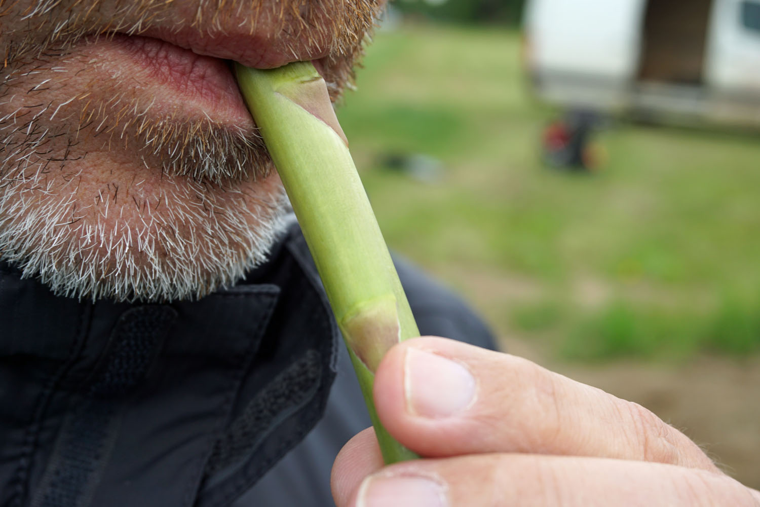 Als wir Bursch besuchen, probieren wir grünen Spargel, Kohlrabi, Salatgurke und Erdbeeren direkt vom Feld beziehungsweise aus dem Gewächshaus. Die Freilandsaison hat erst vor etwa zwei Wochen begonnen, sagt Bursch. Das hängt natürlich mit dem Wetter zusammen. Überhaupt ist das Wetter ein unberechenbarer Faktor für seine Arbeit: Der Handel besteht darauf, dass die Verträge erfüllt werden. Wer also zugesagt hat, täglich oder wöchentlich eine bestimmte Menge zu liefern, muss das halten.