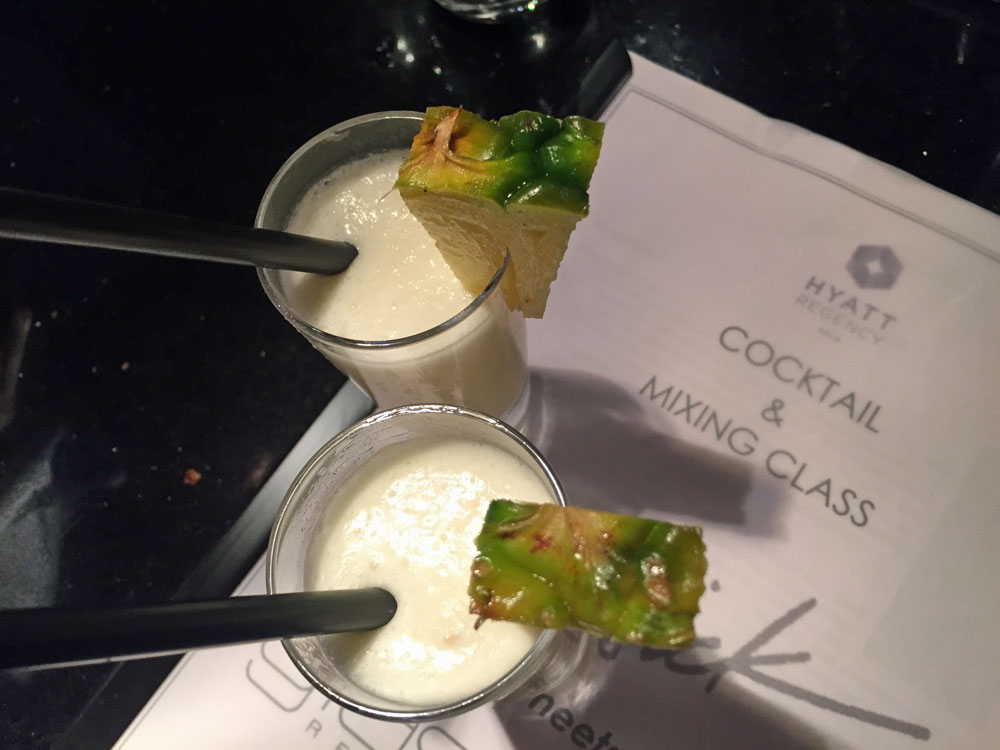 Dazu presst man ein Sieb auf den Becher und kippt den Inhalt durch das zweite Sieb ins Martiniglas. Zwei Gläser füllt jeder Teilnehmer, die vier Cocktails werden unter allen brüderlich mit Strohhalmen geteilt. Eineinhalb Stunden später hatten wir Ipanema getestet, Sex on the Beach, Mai Tai und zum Abschluss gab’s für jeden noch ein Schnapsglas voll Pina Colada – mit Kokosnussmilch, nicht mit Sahne.