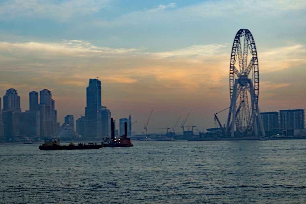 90 Prozent der Bewohner in der Marina in Dubai sind Europäer, lernen wir bei unserer Führung durch die Stadt der Superlative. Kein Wunder: Obwohl hier die meisten sehr hohen Häuser auf einem Fleck stehen, ist Dubai in diesem Stadtteil fast so etwas wie gemütlich. Durch die Häuserschluchten in der Dubai Marina windet sich ein Kanal. Wer hier eine Bootstour macht, sieht eine ganz andere Stadt als bei der Dhau-Fahrt durch den alten Teil Dubais. Die Boote fahren auch ein Stück hinaus aufs offene Meer, und hier kann man einen Blick in die Zukunft Dubais werfen. Denn unermüdlich sind hier Bagger damit beschäftigt, dem Meer weiteres Land abzutrotzen. Links in Fahrtrichtung kommt außerdem das Dubai Eye in Sicht, das geplante Riesenrad, das höher ist als das in London – natürlich.