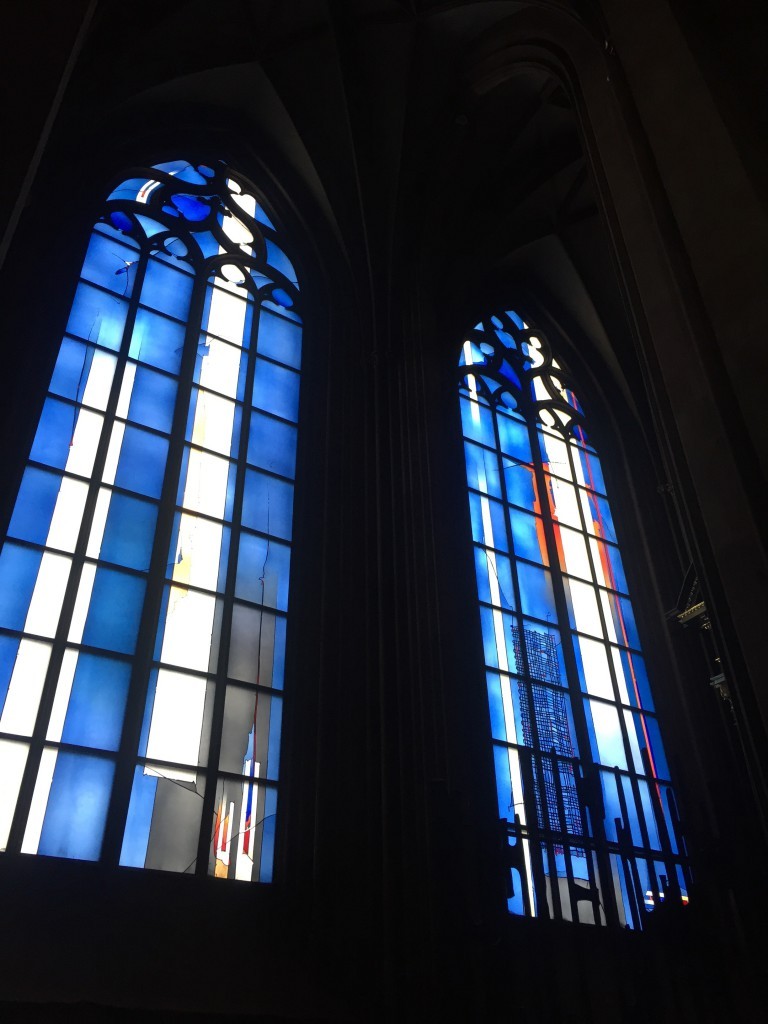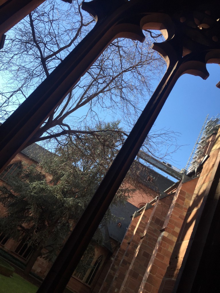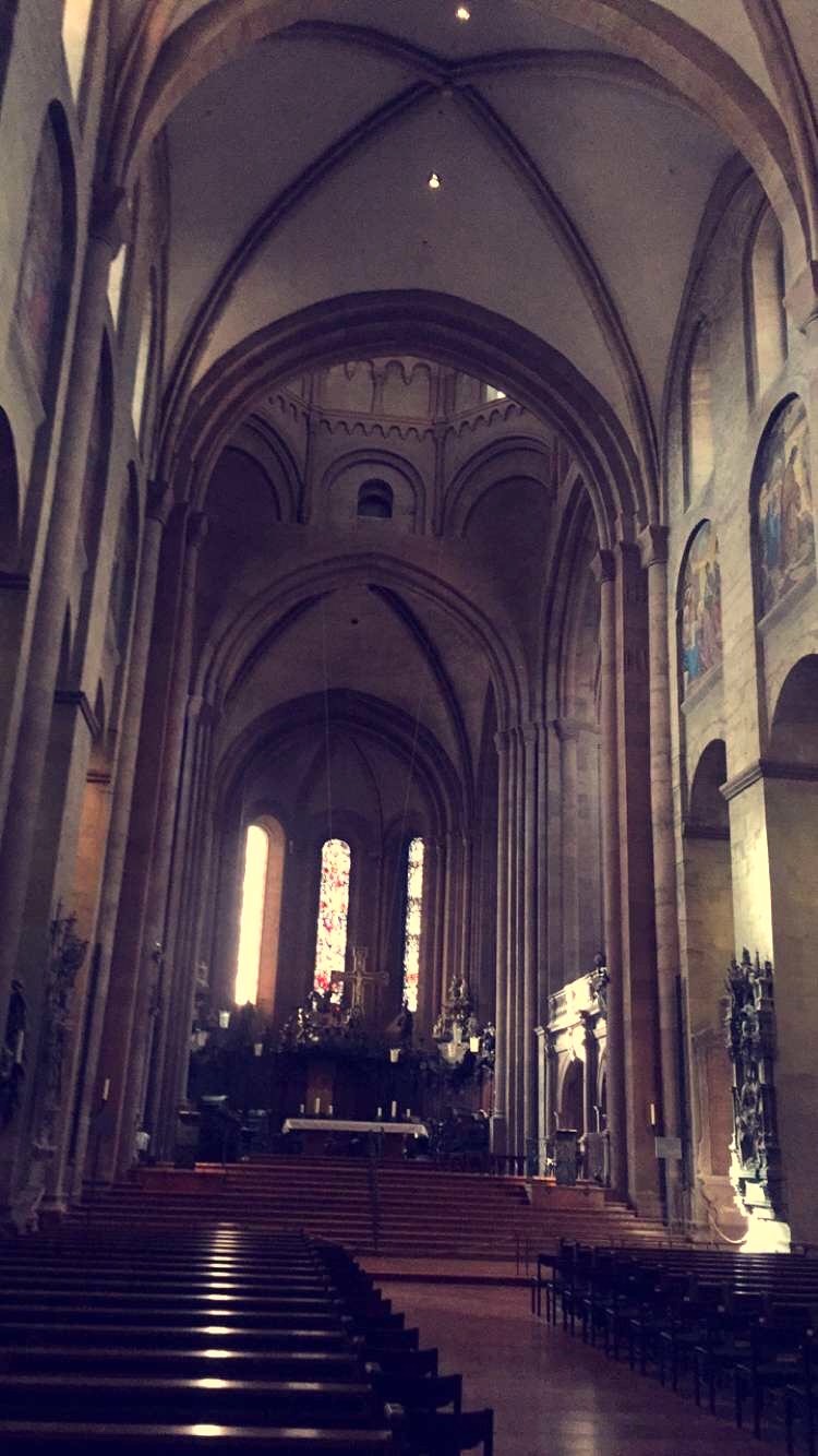 Durch eine Seitenstraße nähern wir uns langsam dem Marktplatz und somit auch dem Dom: In dieser Ecke der Stadt gehören seit Jahrhunderten viele Häuser der katholischen Kirche. Dann stehen wir im Kreuzgang des Doms, der ebenfalls aus der Zeit Johannes Gutenbergs ist. Im Inneren der großen Kirche schauen wir uns noch einige Statuen und vor allem die blauen Fenster an. Schließlich führt uns der Weg weiter durch einige Seitengassen bis zu dem Haus, in dem Gutenberg an seinem Lebensende lebte. Wer eine ähnliche Stadtführung auf eigene Faust machen möchte, nutzt am besten die App der Stadt Mainz.