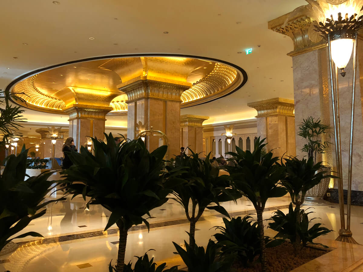 - Emirates Palace. Das Hotel ist eigentlich tatsächlich als Palast konzipiert gewesen. Aber ein Todesfall des federführenden Scheichs führte dazu, dass es anderweitig genutzt werden musste. Heute ist es Teil der Kempinski-Kette. Wir waren dort ohne Reservierung zum Traditional Afternoon Tea – der uns so satt gemacht hat, dass wir das Abendessen ausfallen ließen. Ihn gibt es ab etwa 90 Euro für zwei Personen. Besonders schön: Live-Musik während unseres Aufenthalts und eine wirklich entspannte Atmosphäre.
