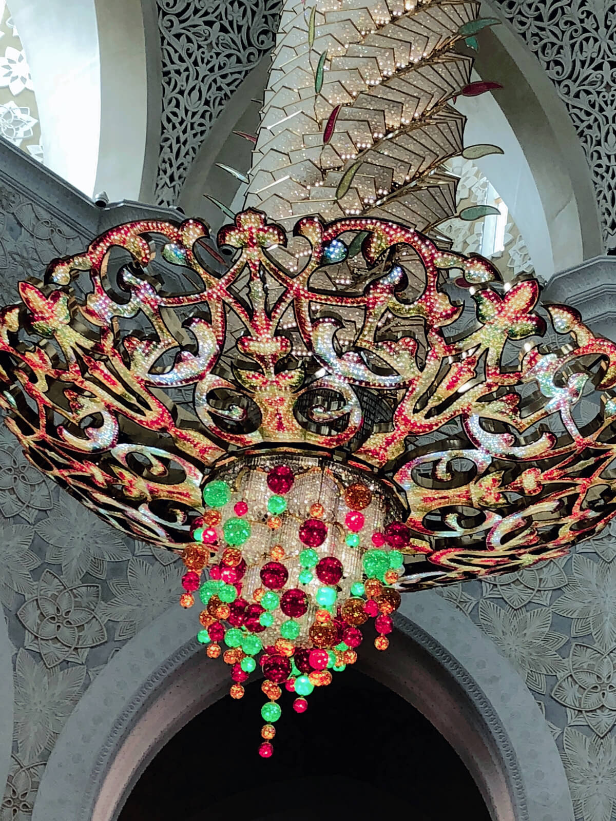 - Große Moschee. Die Shaik Zayed Grand Mosque liegt etwas außerhalb, aber die Anfahrt lohnt sich: In den weißen Marmorboden und die Säulen sind Blumenmotive aus Edelsteinen eingelassen. Der Teppich im Gebetsraum ist der größte der Welt, der Kristallleuchter aus deutscher Produktion. Frauen müssen eine Abaya überziehen und natürlich die Haare verhüllen. Die Abaya bekommt man kostenlos am Eingang geliehen. Von dort wurden wir mit kleinen Wägelchen zum Eingang gefahren.