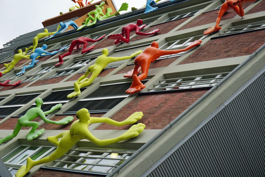 Sie sind gelb, grün und blau, und ihre Hände und Füße sind deutlich übergroß: Flossenmänner kraxeln an einer Fassade nach oben, eine andere windet sich spiegelnd in die Umgebung. Es ist der Medienhafen in Düsseldorf, in dem so unterschiedliche Architektur zu sehen ist, die modernen Häuser begrenzen ein altes Hafenbecken. Aber immer wieder mischt sich auch Bestand unter das Neue: Backsteinbauten stoßen an Glasfassaden, ein alter Kran reckt sich in der Sichtachse zum Rheinturm ins Bild.
