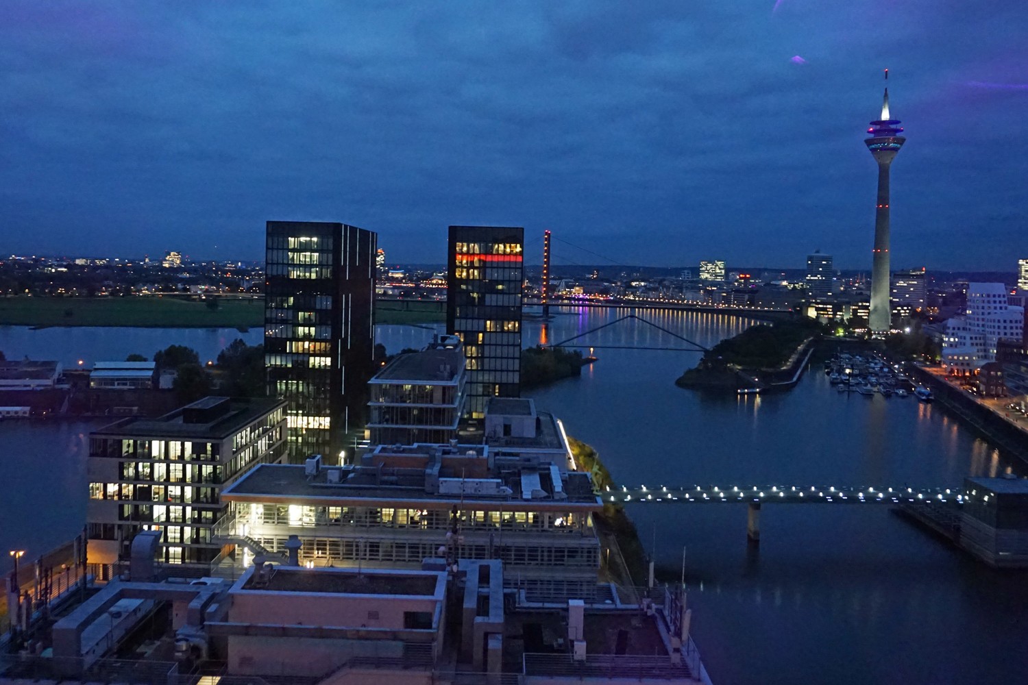 Übrigens gibt es auch eine Möglichkeit, den Medienhafen aus der Vogelperspektive zu fotographieren. Im Hotel Innside by Melia gibt es im 16. Stock die Bar The View. Von dort oben kann man bei einem guten Drink beobachten, wie sich der Hafen verändert, wenn es dunkel wird und das Licht angeht.
