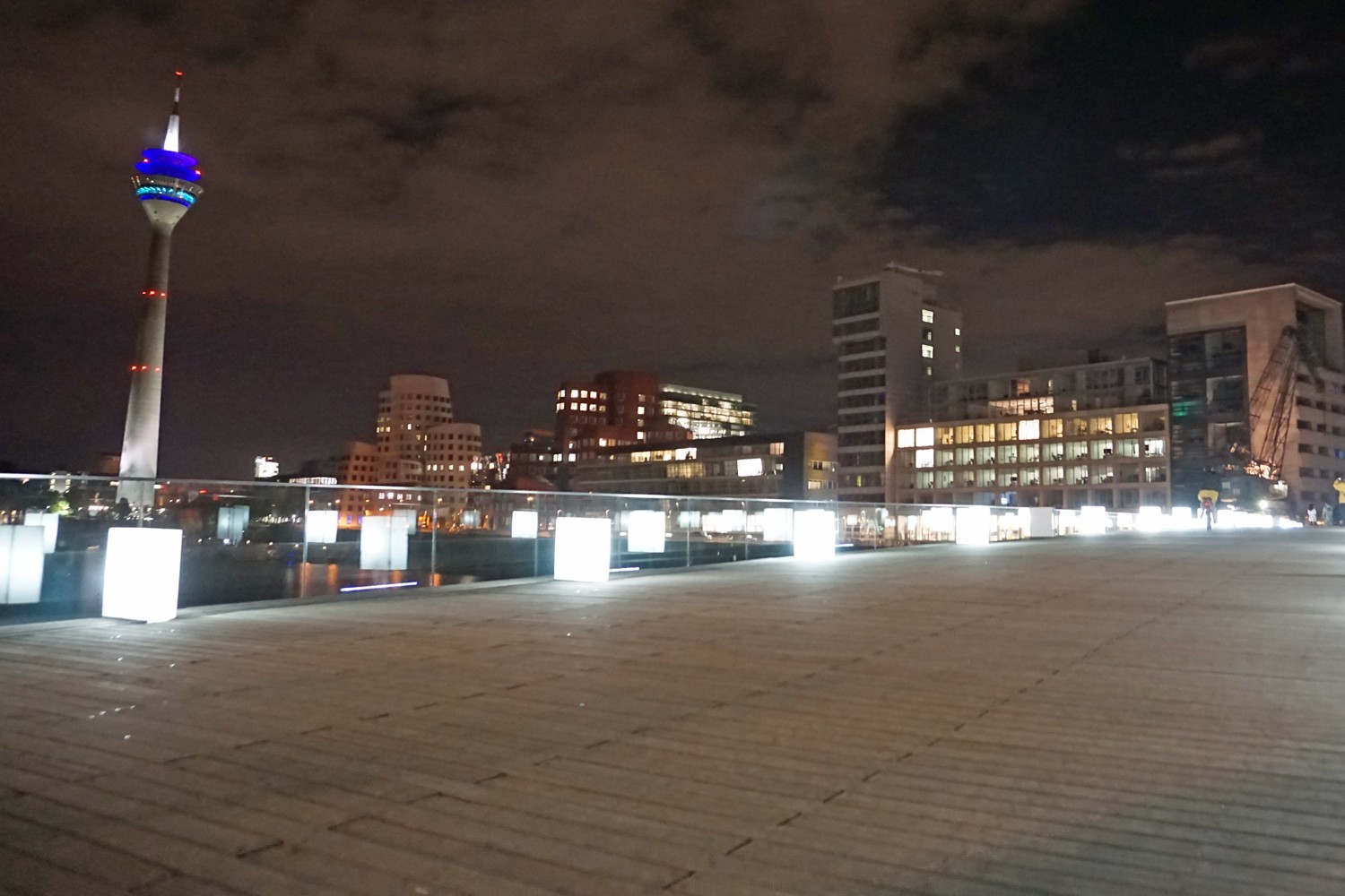 Am Wochenende und bei gutem Wetter ist hier die Hölle los, dann haben die Cafés und Restaurants die Terrassen geöffnet. Besucher*innen flanieren zwischen Rheinturm, Landtag und Hafen hin und her. Ich bin aber endlich einmal unter der Woche an einem Nachmittag da, und das Wetter ist eher so naja. Der große Vorteil: Es ist ruhig. Außer mir sind kaum Besucher da, und ich kann die Architektur endlich mal in aller Ruhe genießen und fotografieren.