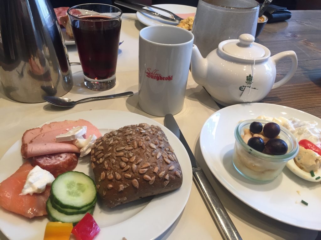 Pancakes! Dicke, goldgebackene Pancakes gibt es in der Schenke im Hotel Schloss Burgbrohl in Rheinland-Pfalz zum Frühstück. Dazu gibt’s Rote Grütze. Ich muss sowohl samstags als auch sonntags je einen essen, weil sie so lecker sind. Einige Gäste haben auch zwei oder drei auf ihrem Teller. Mir wäre das zu eintönig, schließlich gibt es auch Eier- und Hühnchensalat, Matjes, gefüllte Eier und natürlich Brot und Käse. Besonders entzückend finde ich die kleinen Gläschen mit Joghurt und Nüssen – und leider einer Schicht Honig. Den mag ich nicht. Darum nehme ich mir Joghurt und Obstsalat. Zusätzlich zum obligatorischen Orangensaft wird hier übrigens Kirsche-Apfel-Traube-Saft angeboten, eine schöne Abwechslung.