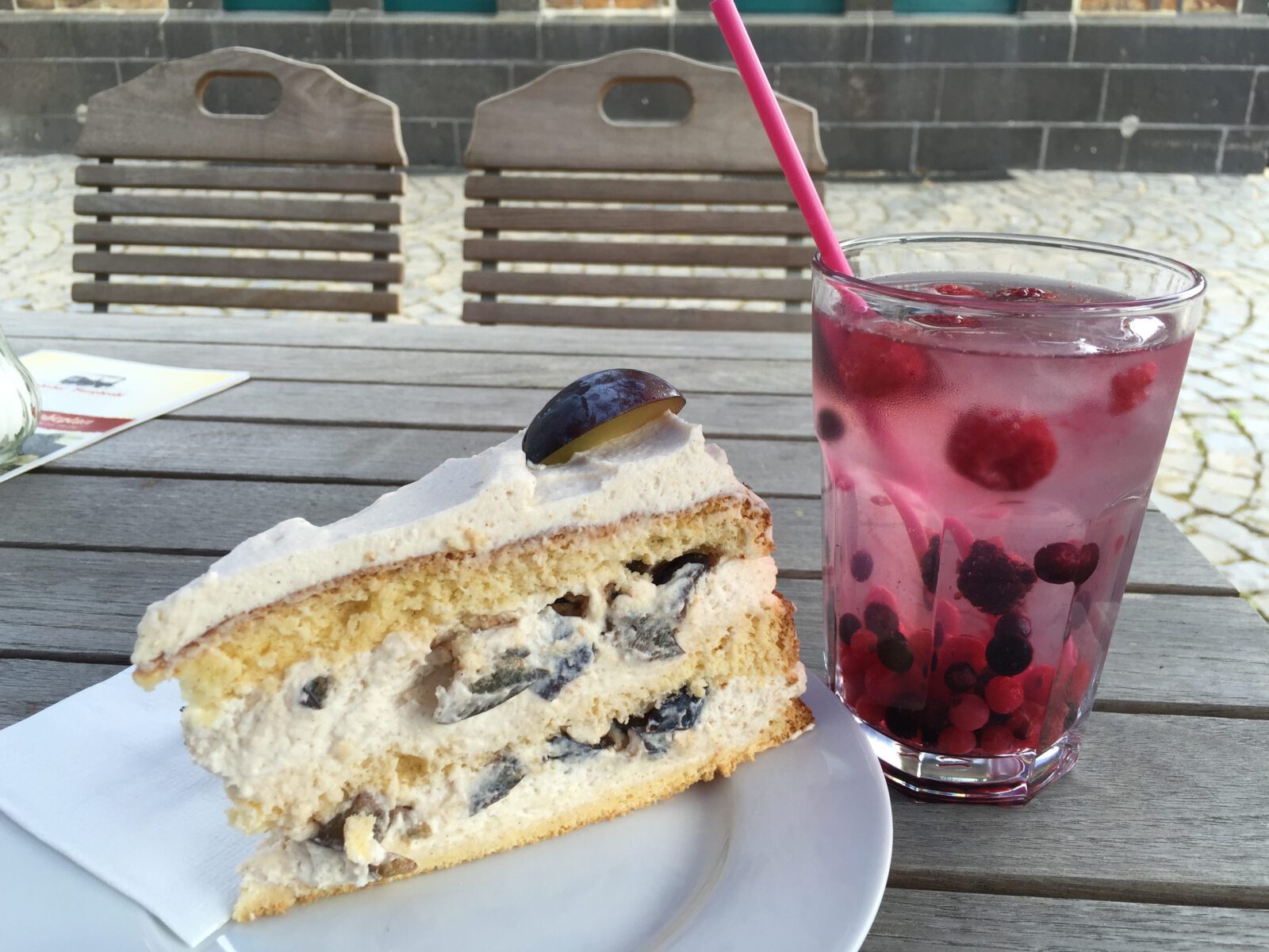 Überhaupt ist das Essen auf Schloss Burgbrohl recht gut: In unserem Groupon-Paket war ein 4-Gang-Menü am ersten Abend inklusive: ein kleiner Salat, ein Süppchen, Fisch mit Gemüse und eine Chia-Crème zum Nachtisch. Samstagnachmittag landeten wir eher zufällig im Alten Bahnhof in Burgbrohl, der restauriert wurde, und ebenfalls zum Schlosshotel gehört. Dort gab es hausgemachte Kuchen und Limonaden. Ich hatte die Waldbeerlimo mit einem Stück Zwetschge-Mascarpone-Torte. Auch sehr lecker.