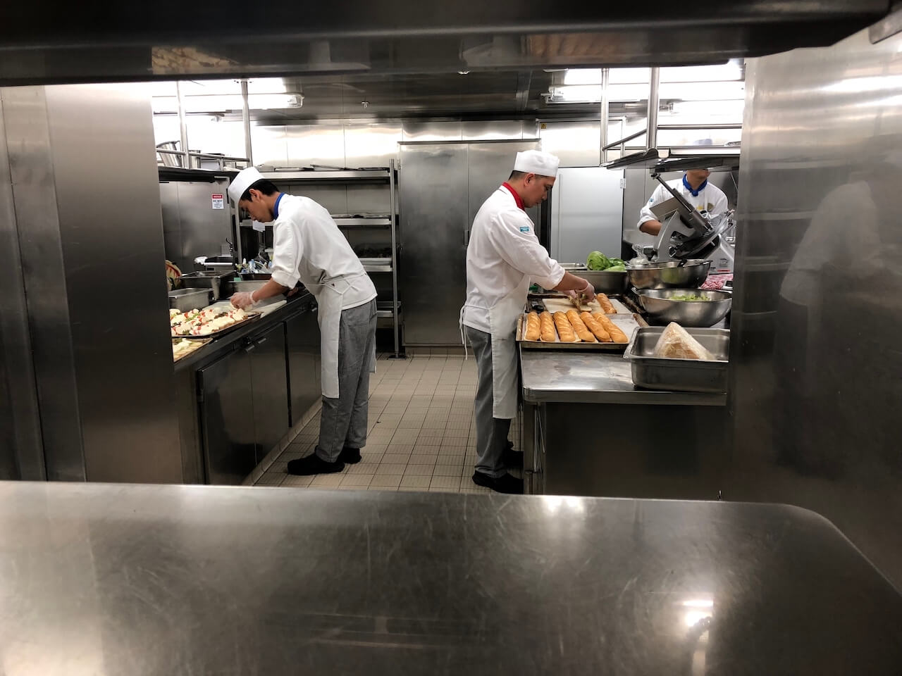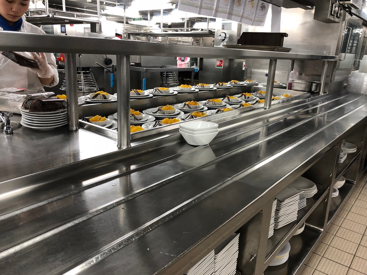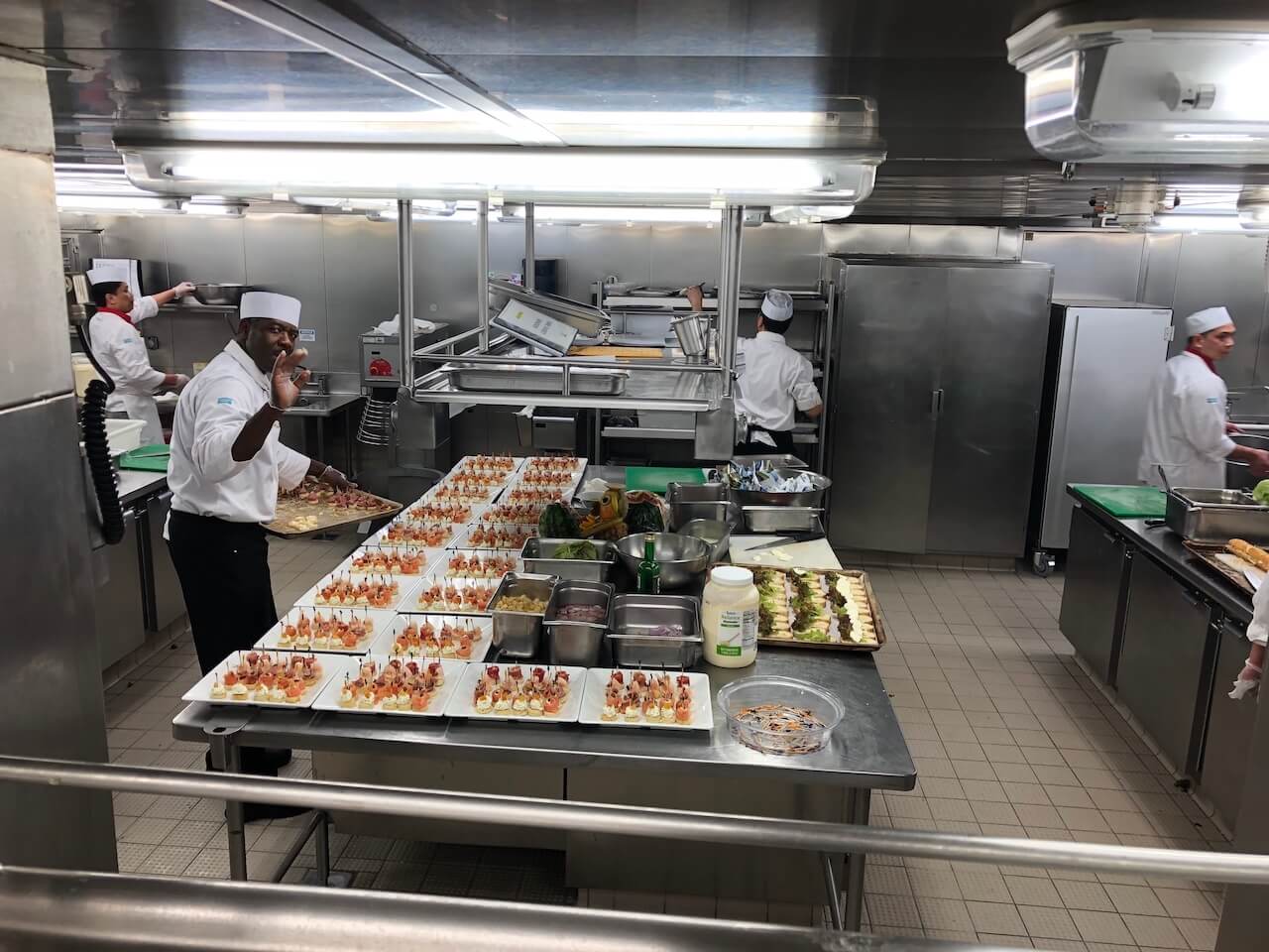 Im Anschluss sind wir in eines der Restaurants und durch die Tür, durch die beim Essen immer die Kellner mit den Tabletts kamen. Nächste Station war also die Küche, was etwas verniedlichend klingt. Mehr als 300 Menschen arbeiten in diesem Bereich im Schichtbetrieb: Es wird gekocht, gebacken, gebraten, vorbereitet, garniert und letztlich wieder alles geputzt und gespült. Die Dimensionen sind beeindruckend, schließlich müssen hier die Mahlzeiten für bis zu 4.000 Passagiere zubereitet werden. Diese Küche versorgt dabei die drei Hauptrestaurants des Schiffs. Für die kleineren Spezialitätenrestaurants gibt es jeweils eigene Küchen.