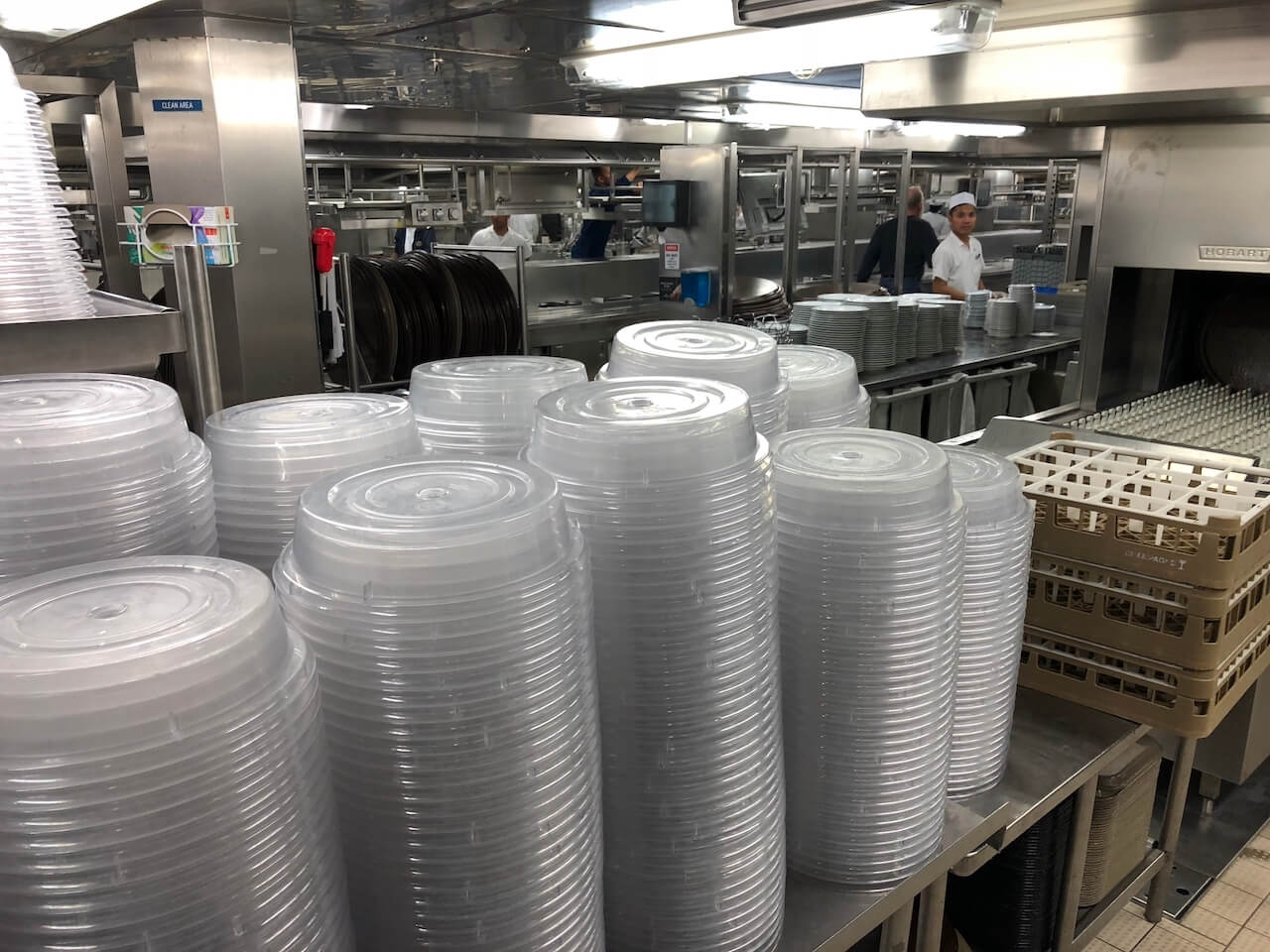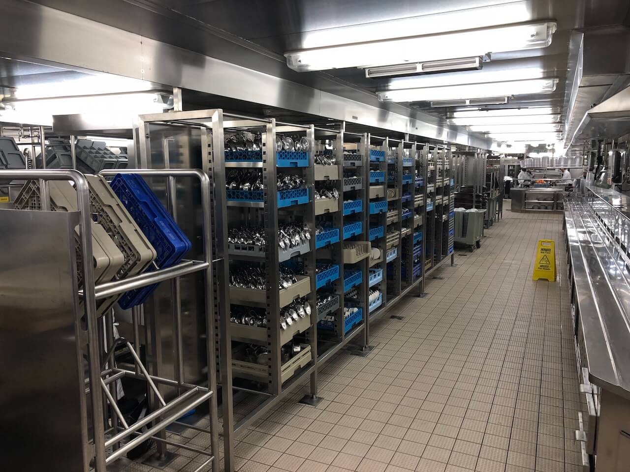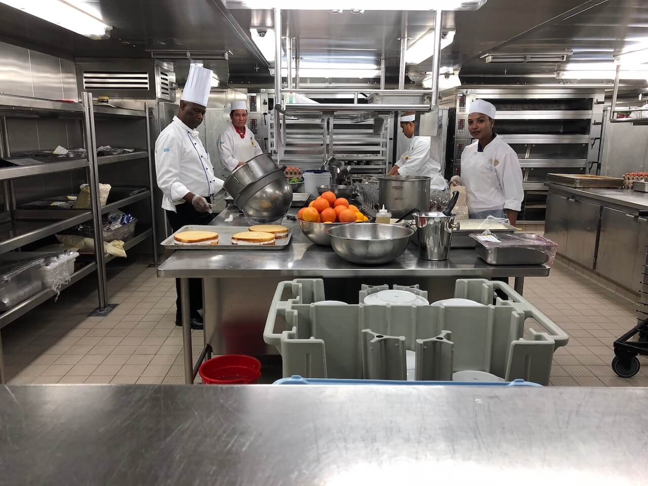Im Anschluss sind wir in eines der Restaurants und durch die Tür, durch die beim Essen immer die Kellner mit den Tabletts kamen. Nächste Station war also die Küche, was etwas verniedlichend klingt. Mehr als 300 Menschen arbeiten in diesem Bereich im Schichtbetrieb: Es wird gekocht, gebacken, gebraten, vorbereitet, garniert und letztlich wieder alles geputzt und gespült. Die Dimensionen sind beeindruckend, schließlich müssen hier die Mahlzeiten für bis zu 4.000 Passagiere zubereitet werden. Diese Küche versorgt dabei die drei Hauptrestaurants des Schiffs. Für die kleineren Spezialitätenrestaurants gibt es jeweils eigene Küchen.