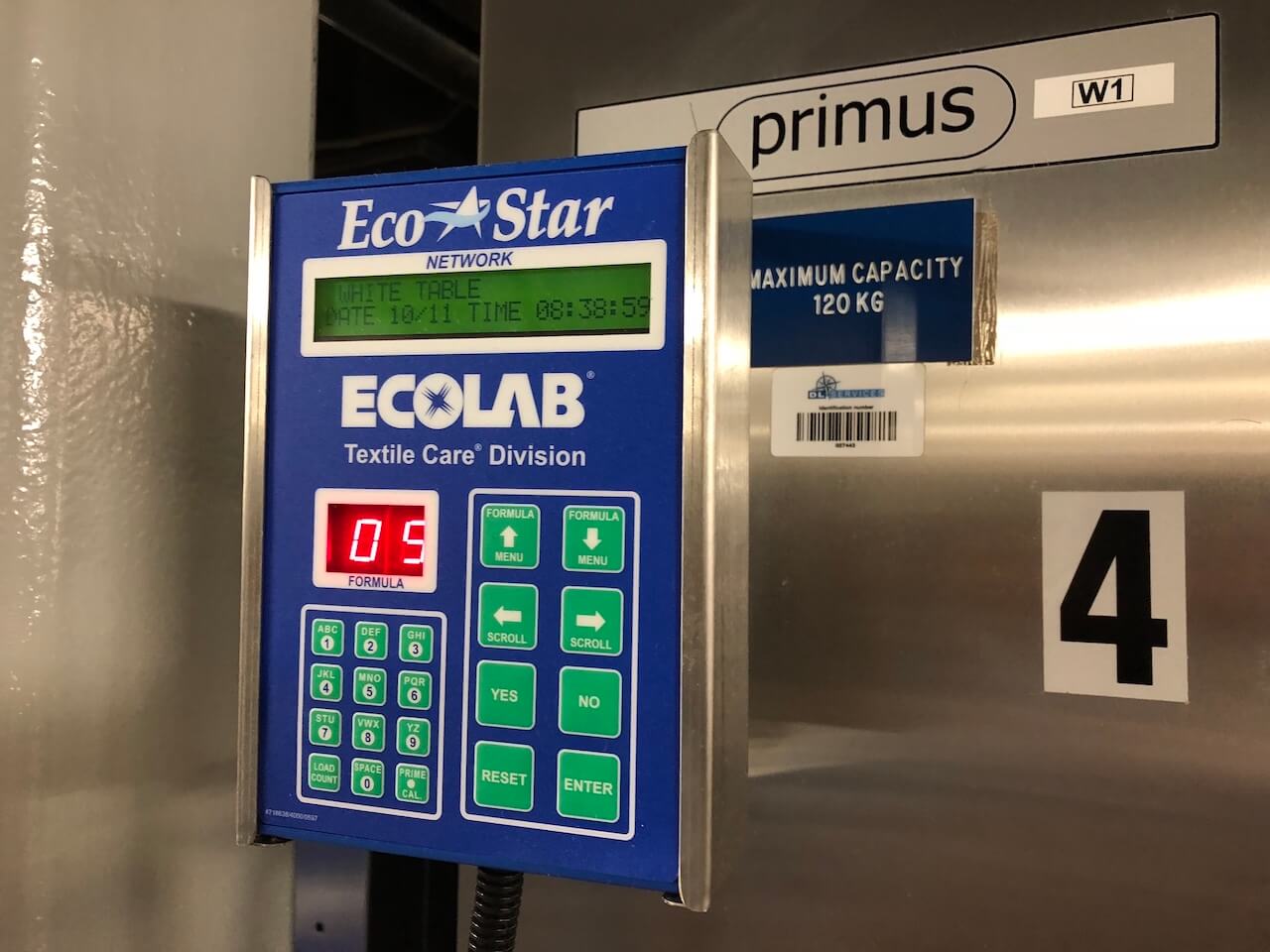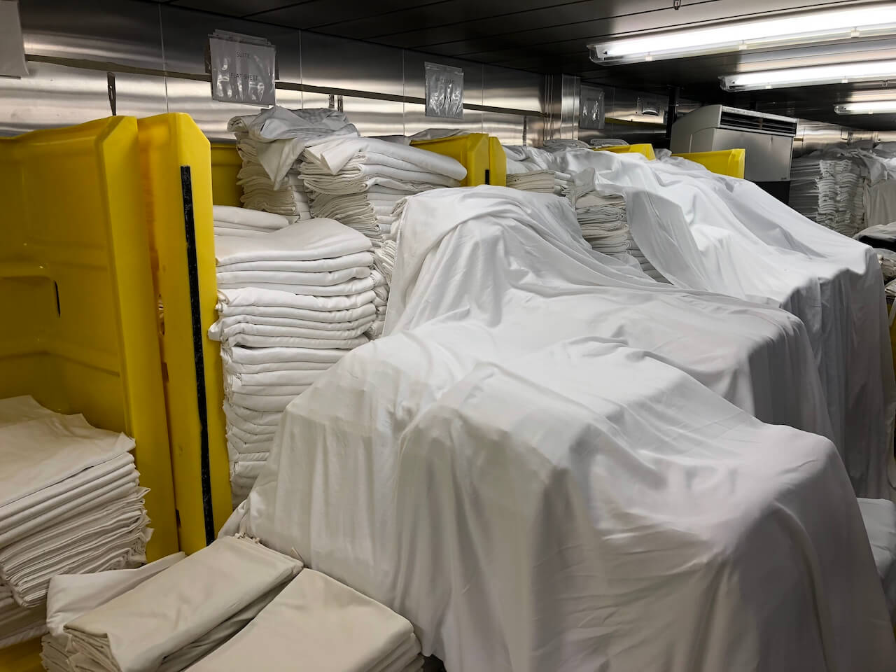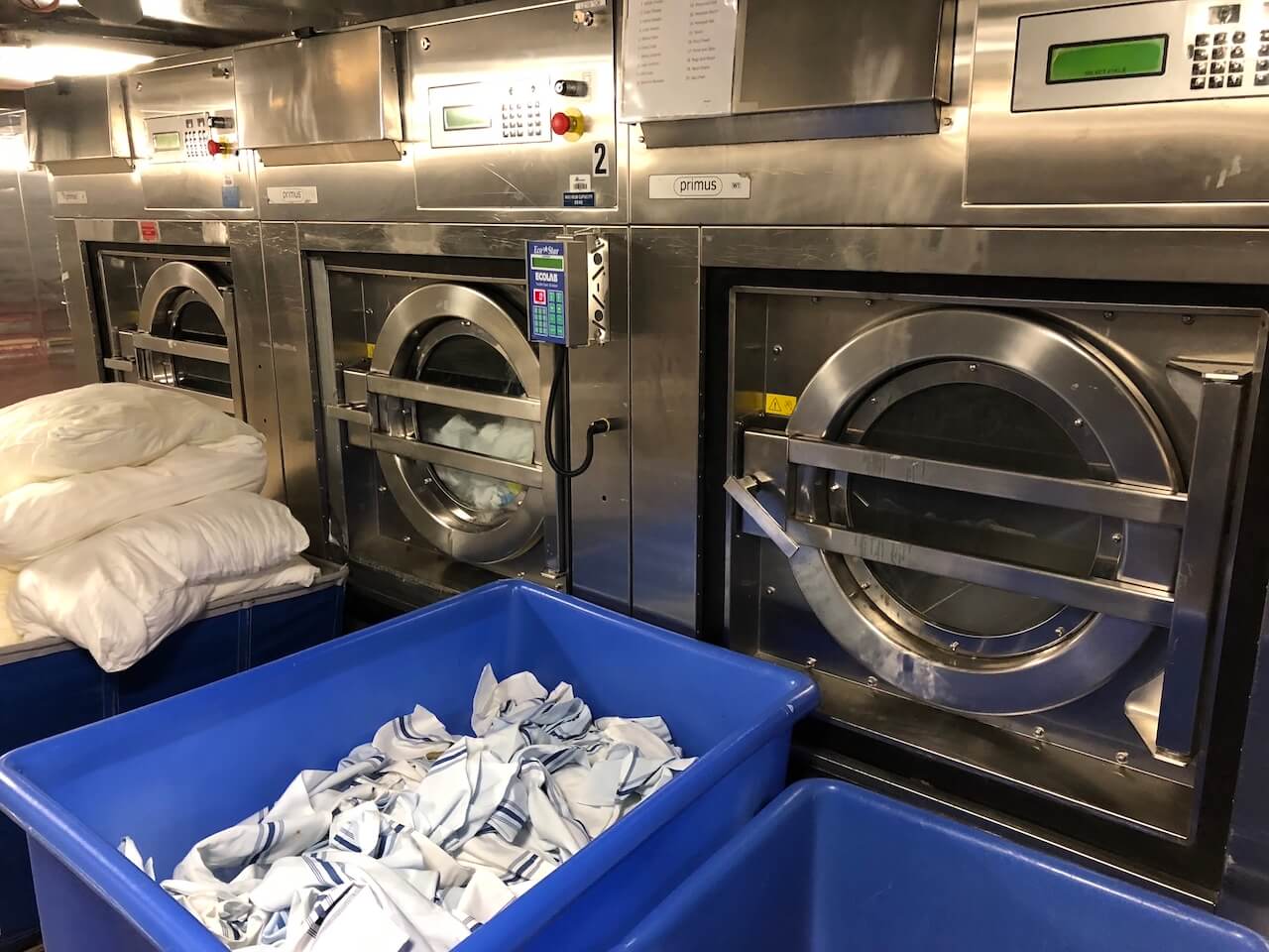 Meine Waschmaschine zuhause verträgt ungefähr 4 Kilo Wäsche. Die größte, die in der Wäscherei an Bord gesehen habe, hat eine Kapazität von 120 Kilo. Davon standen dann drei da. Mit einer normalen Haushaltswaschmaschine wären die Wäscheberge eines Schiffs auch nicht zu schaffen. Jeden Tag werden tausende Handtücher, Tischdecken und Servietten, Bettwäsche und die Uniformen der Crew durch die Wäscherei des Schiffs geschleust. Außerdem lassen viele Passagiere zwischendurch ein paar Teile waschen.