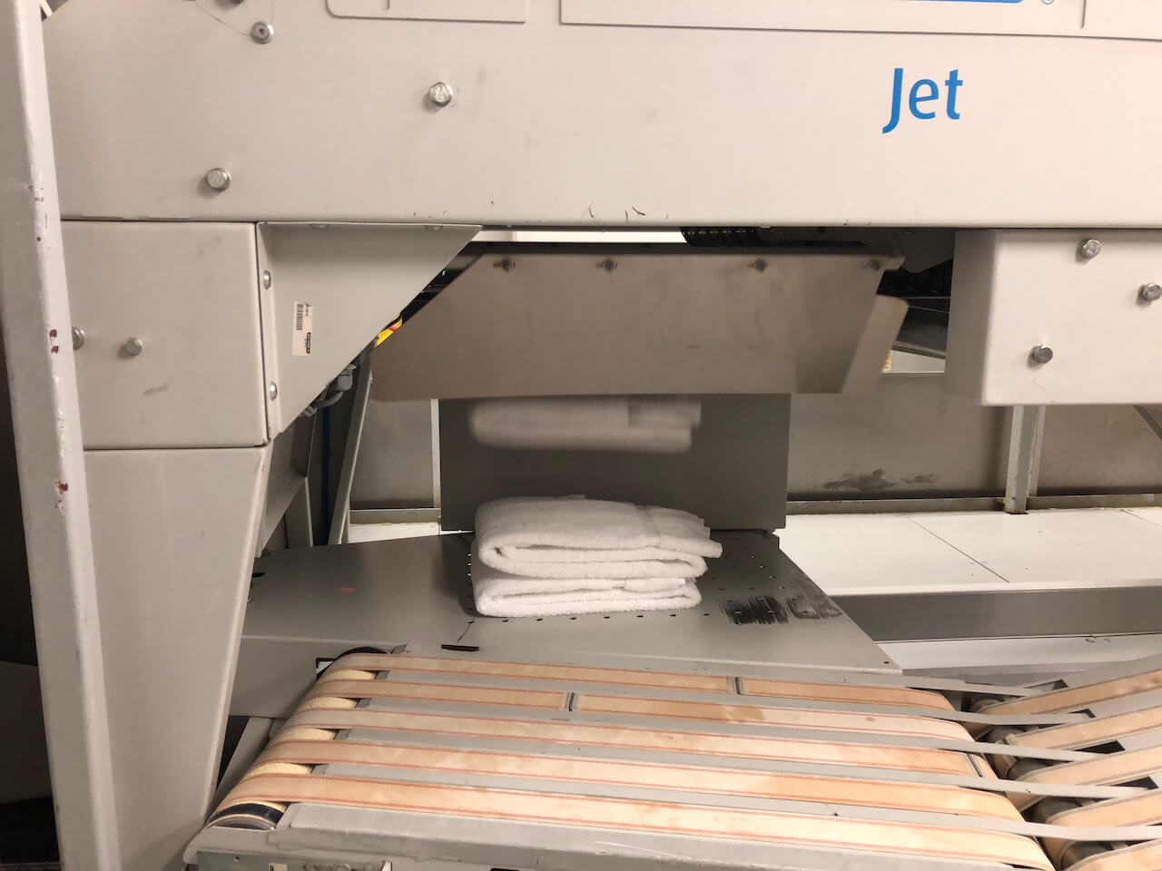 25 Menschen kümmern sich hier um die Wäsche, die Atmosphäre ist warm und feucht. Es gibt neben den Waschmaschinen Trockner, Bügelstationen, Mangeln und Nähmaschinen, mein ganz persönliches Highlight: der Handtuchfalter. Vorne werden Handtücher eingelegt und im Sekundentakt fallen sie akkurat gefaltet aus der Maschine wieder raus. Eine ähnliche Maschine gab es für die Betttücher, die von bis zu vier Menschen gleichzeitig bestückt werden kann.