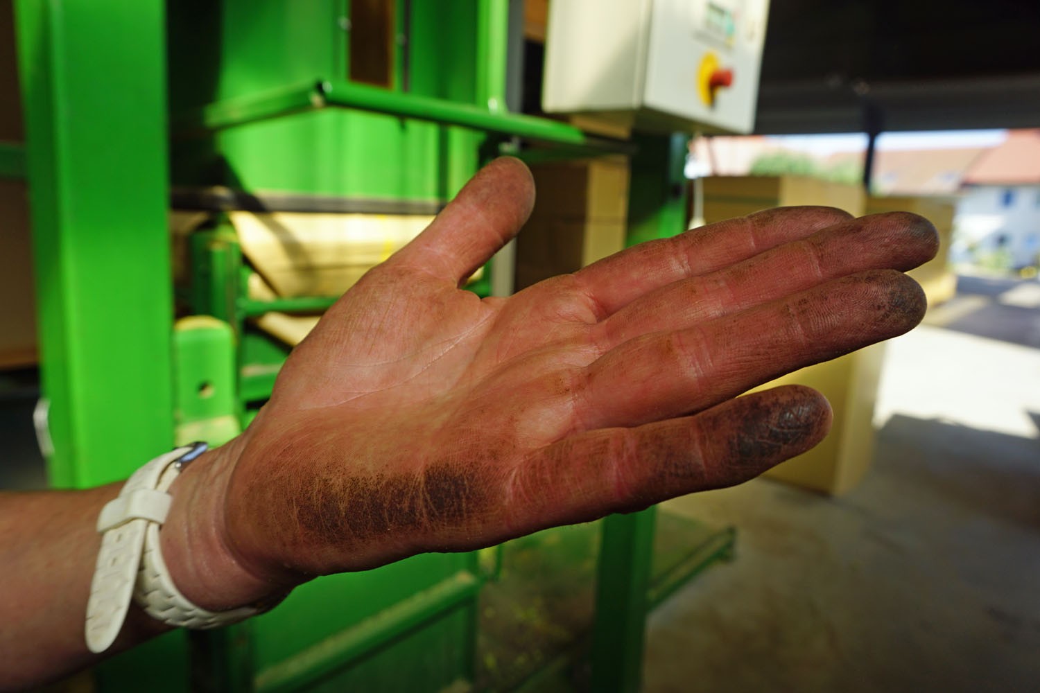 Ist der Hopfen bereit für die Ernte, fährt ein Traktor durch die schmalen Gänge zwischen den Reben und reißt diese oben ab. Sie fallen hinten auf den Anhänger und werden so zum Hof gebracht. Zur Weiterverarbeitung trennt man zunächst die Hopfendolden von den Blättern und Stängeln. Dann transportiert ein Förderband die Dolden in die Darre. Dort trocknen sie je nach Größe, Sorte und Wetter bis zu eineinhalb Stunden. Dann fallen sie in drei überdimensionierte Schubladen, von denen jede etwa 400 Kilogramm Hopfenblüten fasst. In Kammern werden sie im nächsten Schritt bis zum Sollwert von maximal zehn Prozent mit Wasser befeuchtet. „Das passiert in der so genannten Konditionierung“, sagt Buchner. „Kondi nennen wir Hopfenbauern das.“ Dort liegen die Hopfendolden bis zu vier Stunden.