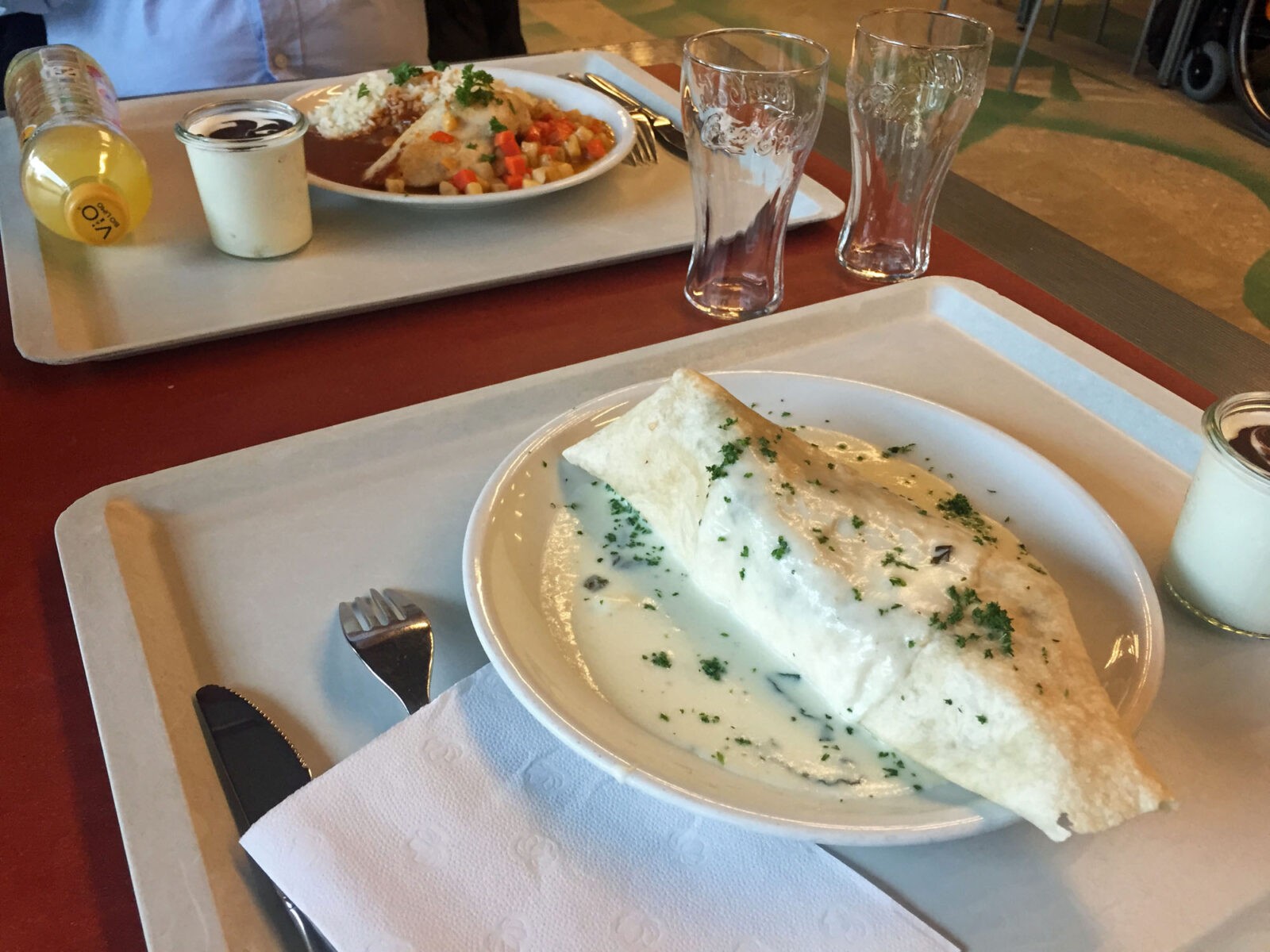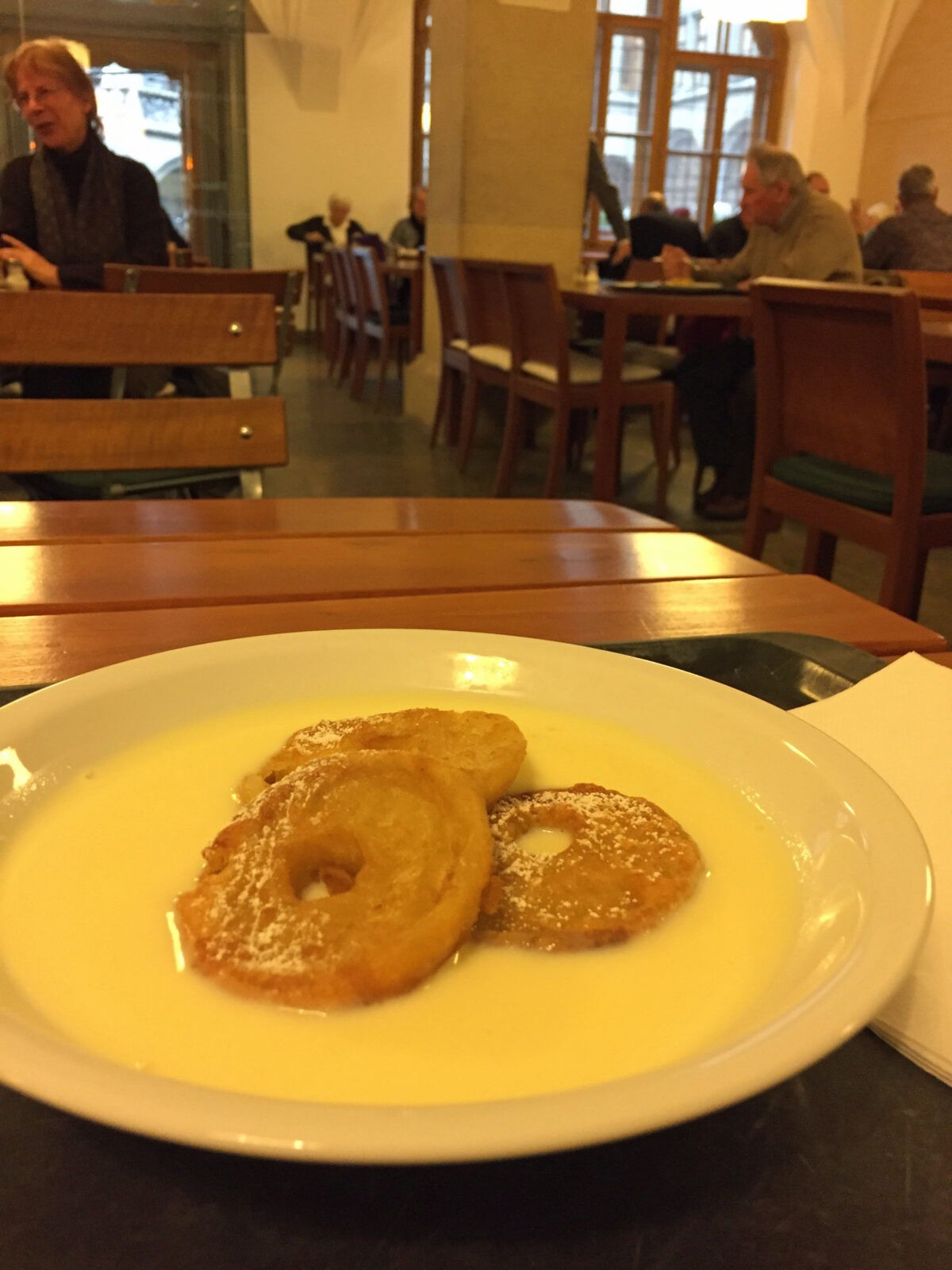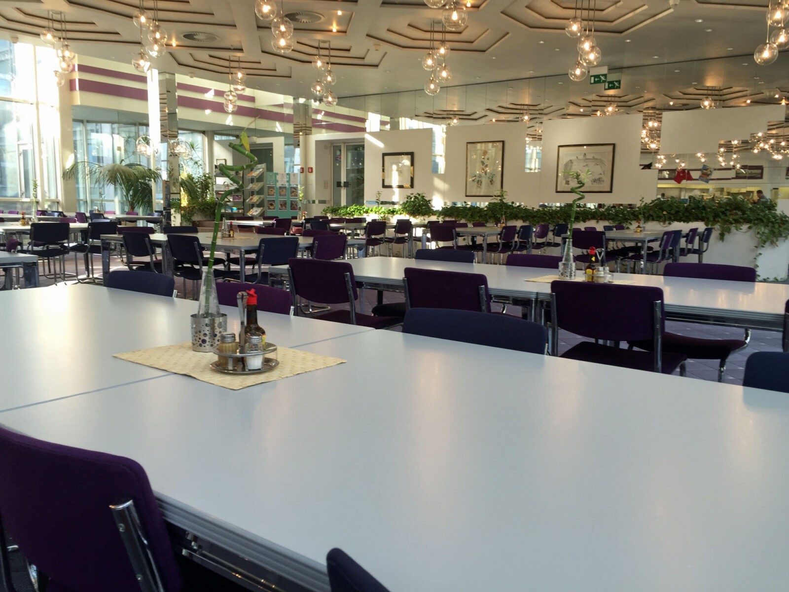 Außerdem war ich in Düsseldorf in der Kantine, und zwar im Finanzministerium NRW. Dort habe ich sehr bodenständiges Essen bekommen: Linsensuppe mit Würstchen. Die Kantine wurde erst vor kurzer Zeit neu gestaltet. Als wir um halb zwölf da waren, war es noch ziemlich leer. Die Kantine ist auch für Arbeitnehmer von außerhalb geöffnet: Vor allem die Mitarbeiter umliegender Banken, so sagt man mir, nehmen diese Option gerne an. Sie zahlen allerdings etwas mehr für eine Mahlzeit als die Ministeriumsmitarbeiter.