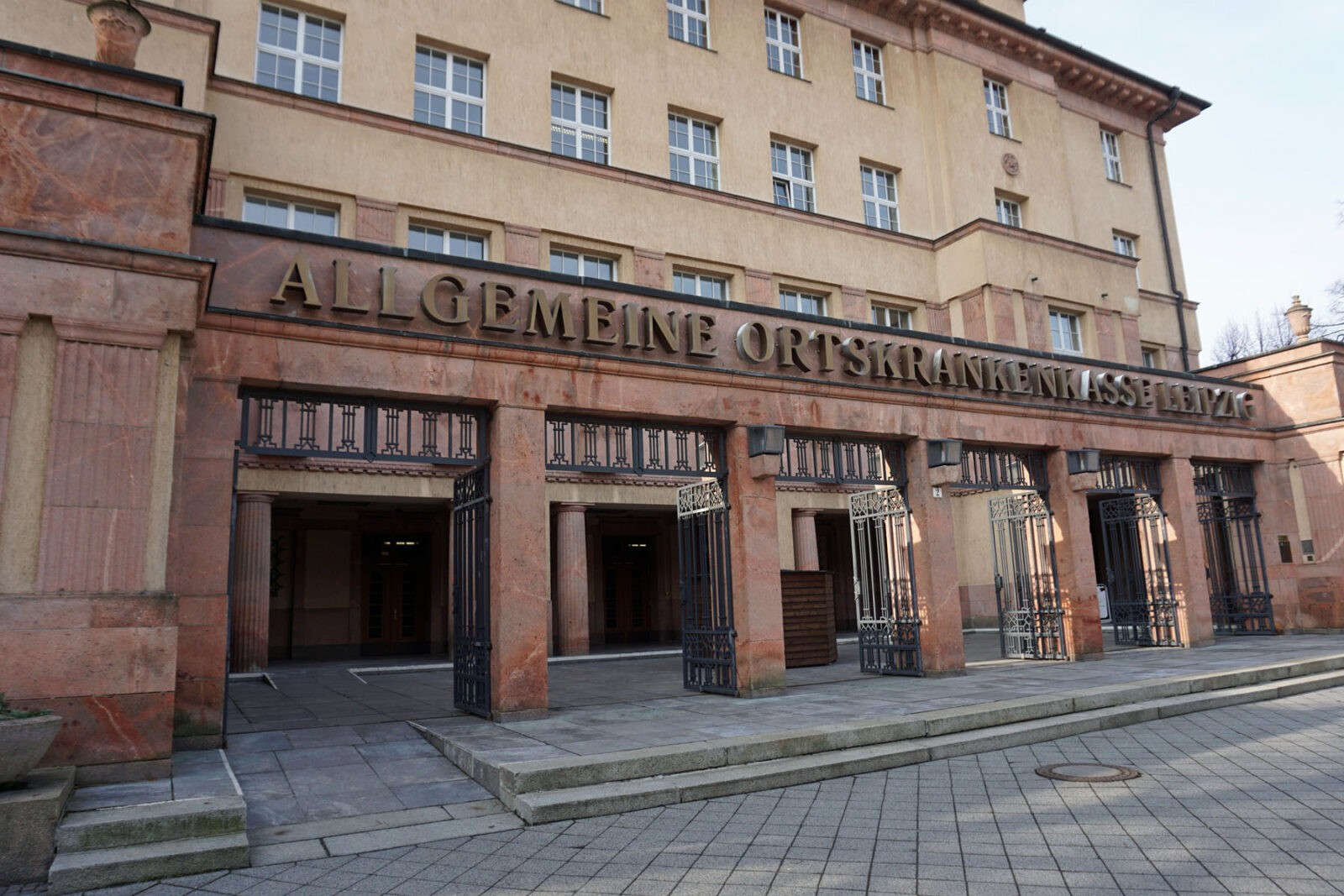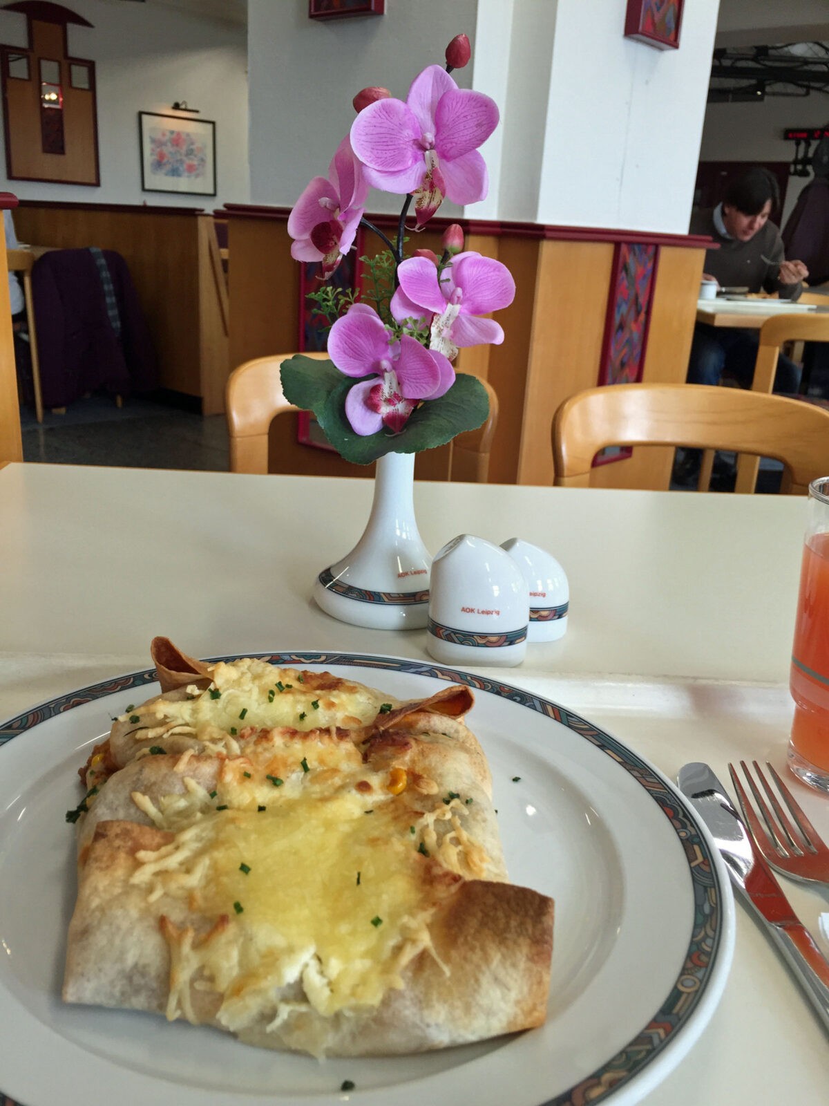 Weil ich so großen Spaß am Essen in öffentlichen Kantinen entwickelt habe, war ich neulich auch bei der AOK in Leipzig essen. Der Eingang aus roten Steinen und mit wuchtigen Pfeilern ist ausgesprochen sehenswert. Die Kantine selbst ist leider nicht so hübsch wie das Haus, sie wirkt etwas verstaubt, hat den Charme der 80er, und erinnert mich aufgrund der Besucher irgendwie an eine Krankenhauscafeteria. Allerdings ist das Essen gut: Ich habe einen Burrito mit Hackfleisch und Gemüse, eine riesige Portion, die mich für den Rest des Tages total satt macht. So satt, dass ich das Stück spanische Mandeltorte, das ich mir in einem marokkanischen Café auf der Karl-Heine-Straße gekauft habe, erst nach vielen Stunden essen konnte. Der Preis in der Kantine ist übrigens auch ausgesprochen fair: Ich zahlte ungefähr 5 Euro – und zum Essen gab es Grapefruitsaft. Das ist eher ungewöhnlich, erfreut mich aber sehr, denn ich liebe Grapefruitsaft.