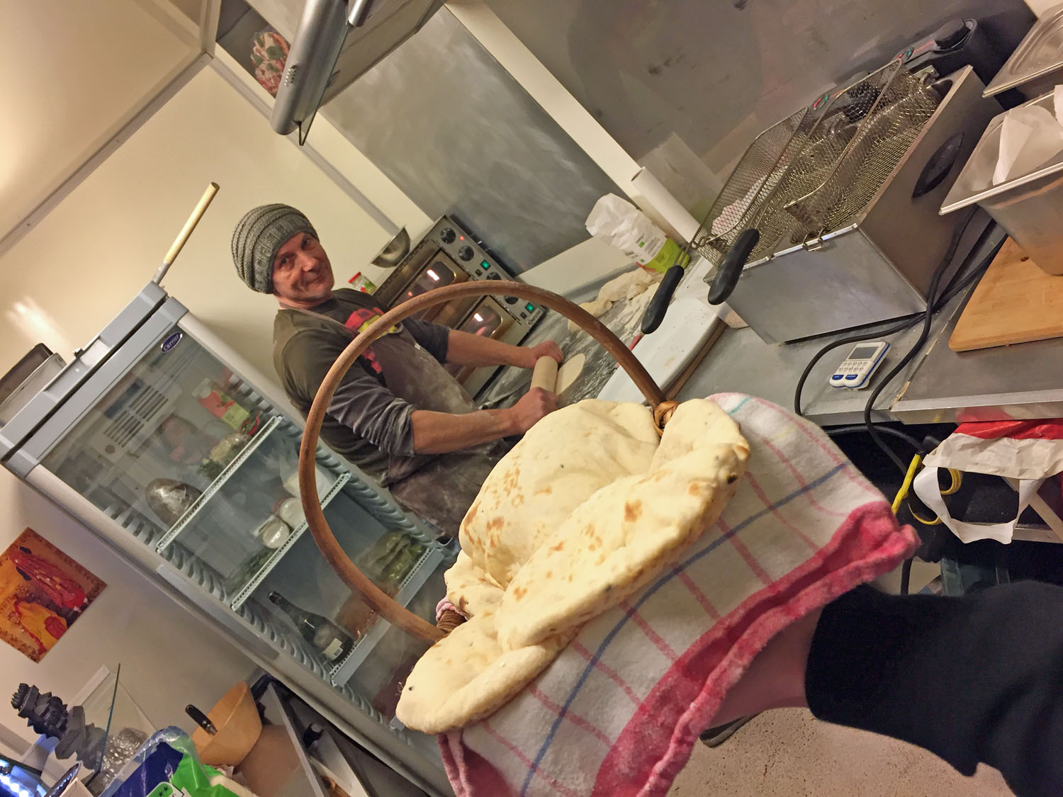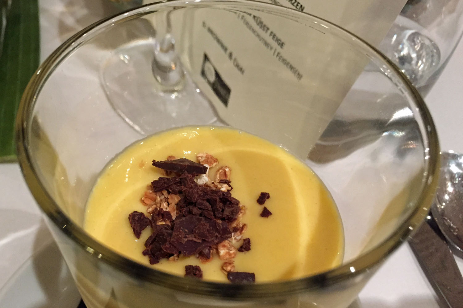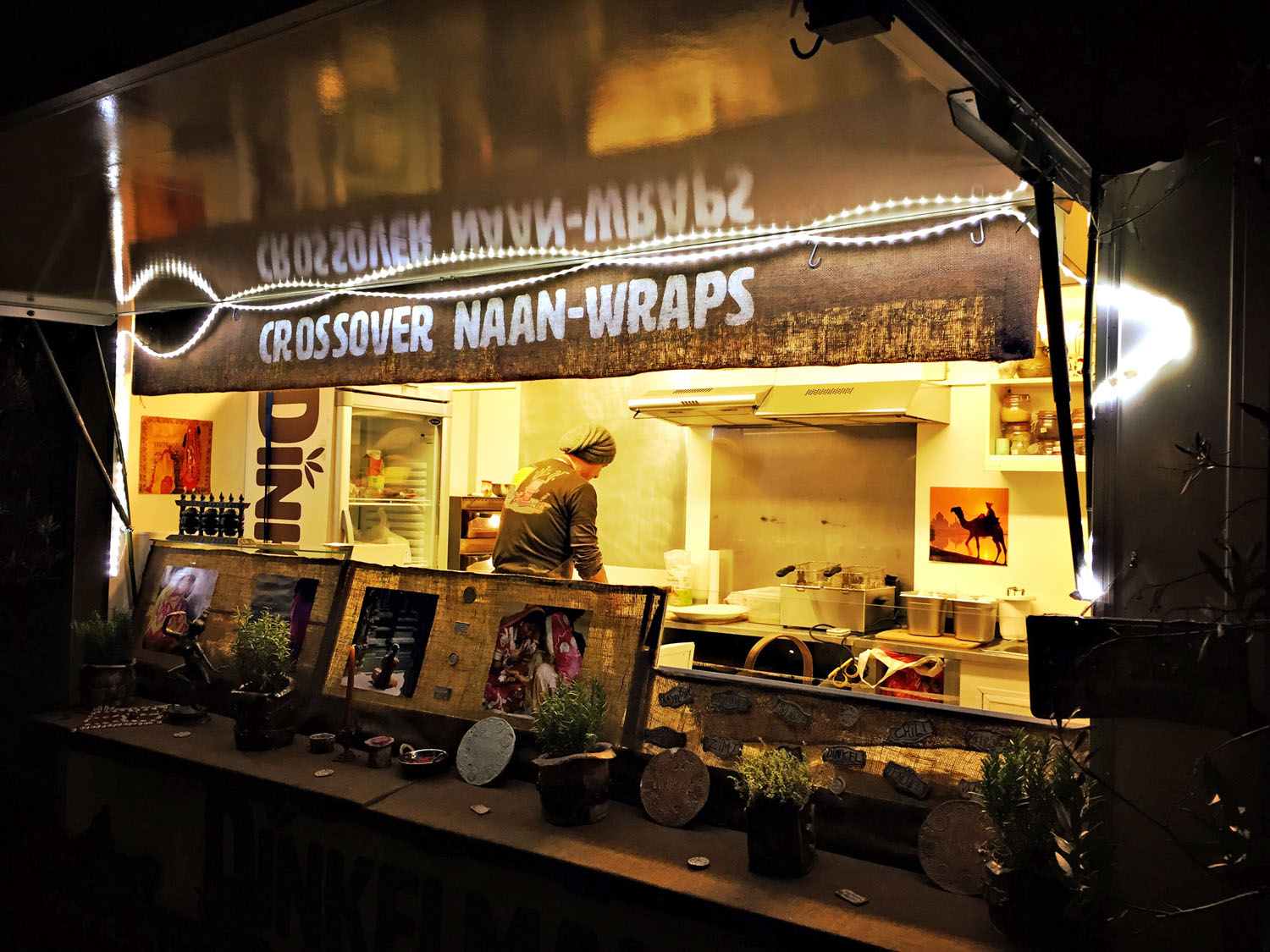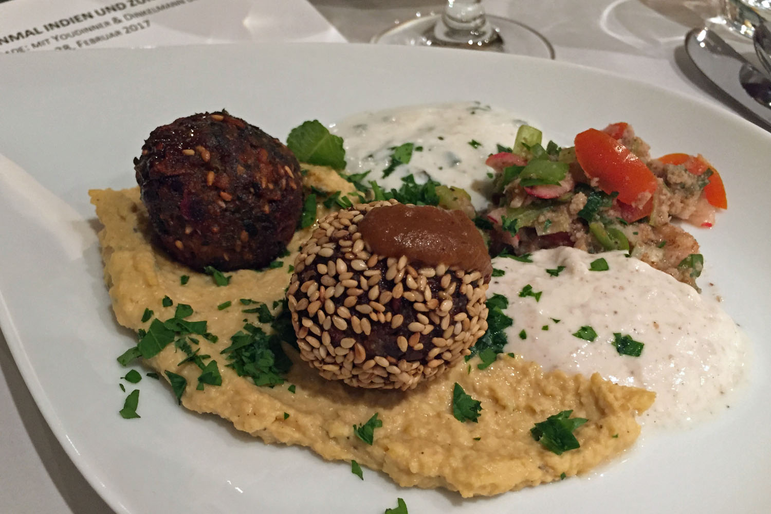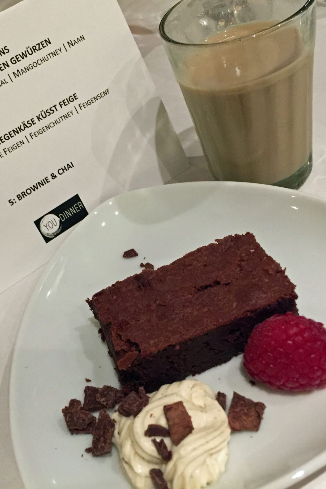 An unserem Abend kochten zwei Streetfoodköche, bekannt als Dinkelmann. Die beiden haben in ihrem Leben viel Zeit in Indien verbracht und dort tief in verschiedene Kochtöpfe geschaut. Die Rezepte brachten Sie nach Deutschland. So bieten sie beispielsweise einen Naan-Wrap aus ihrem Streefoodwagen heraus an. Zum frischgebackenen Naan gab es bei uns einen Aperitif aus Ayurveda-Tee mit Bitter Lemon und Sekt. Außerdem aus Indien einen Mango-Lassi, Dhal, Currys und Chutneys. Dann kam ein Hauch Marrakesch: Falafelbällchen mit Hummus und Couscous. Schließlich überraschend etwas Frankreich mit köstlichem Ziegenkäse auf Gemüse und mit einem wunderbaren Feigensenf. Und zum Abschluss einen Bissen USA mit einem schokoladigen Brownie. Das Menü war super, ich musste nur bei den beiden letzten Gängen gut die Hälfte übriglassen, weil ich einfach zu satt war. Oder anders gesagt: Ich hatte zu Beginn zu großen Hunger und habe zu viel Naan gegessen.