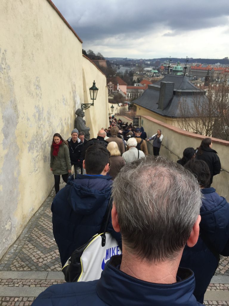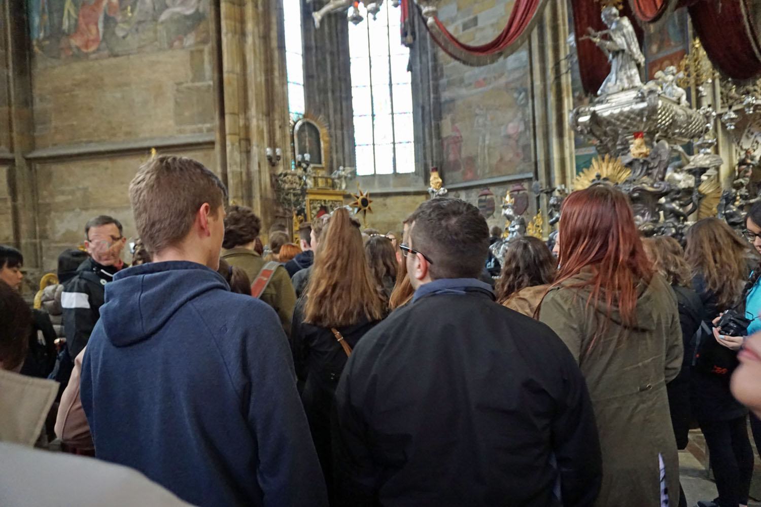 Schlangen gehören aber auch an anderen Orten zu unserem Urlaubsalltag: Vor jeder Sehenswürdigkeit stehen wir an, besonders lang am nächsten Tag vorm Veitsdom. Endlich in der Kathedrale winden wir uns in einer langen Schlange einmal durch das Gotteshaus. Auch auf der Karlsbrücke knubbelt sich die Menschenmenge.
