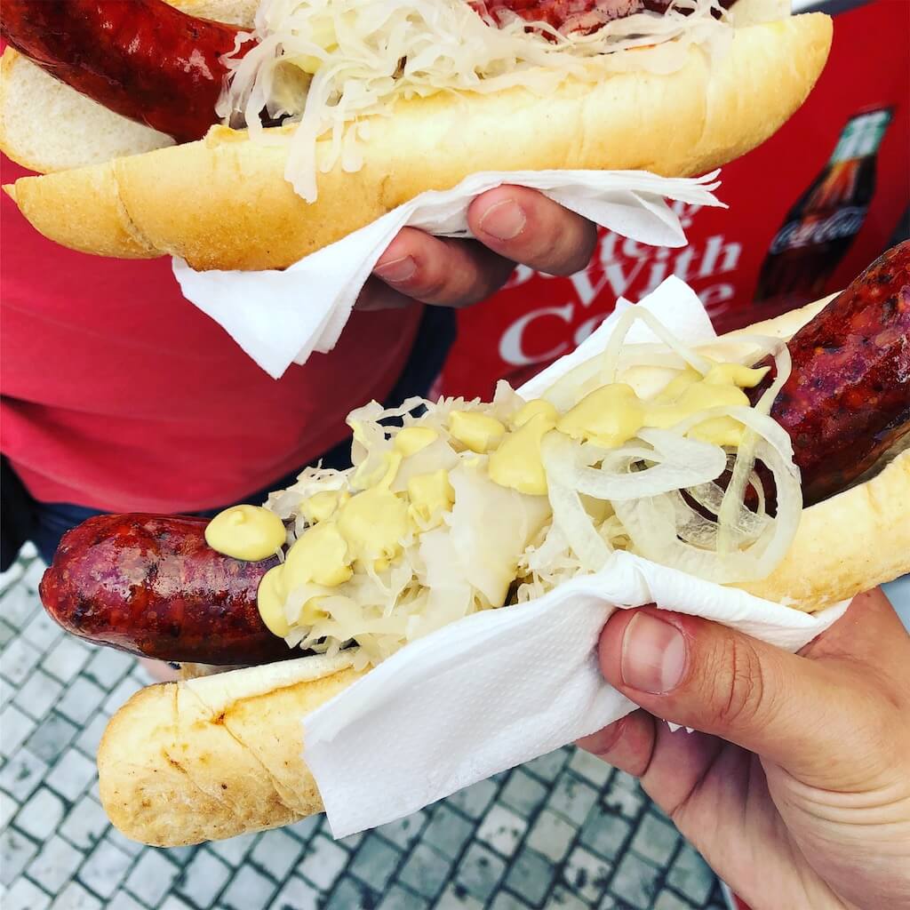 Einmal tappt man dann doch in die Touri-Falle. Direkt am Altstadtplatz werden auf offenem Feuer große Schweine gebraten und dann der berühmte Prager Schinken frisch vom Schwein verkauft. Die Preisangaben beziehen sich auf 100 Gramm und sind in Tschechischen Kronen ausgezeichnet. Nun macht der Umrechnungskurs von 25 zu 1 die Umrechnung eigentlich nicht so schwierig, aber da man dann eine fertige Portion vor sich stehen hat, und in der Regel hungrig ist, kam zumindest mein Gehirn nicht mehr hinterher. Ergebnis: eine zugegebenermaßen große Portion, die für zwei gereicht hat, und zwei Bier haben umgerechnet fast 40 Euro gekostet. Lecker war der Schinken trotzdem. Besser und deutlich günstiger sind die Imbissbuden am Wenzelsplatz. Hier gibt’s leckere tschechische Bratwürste.