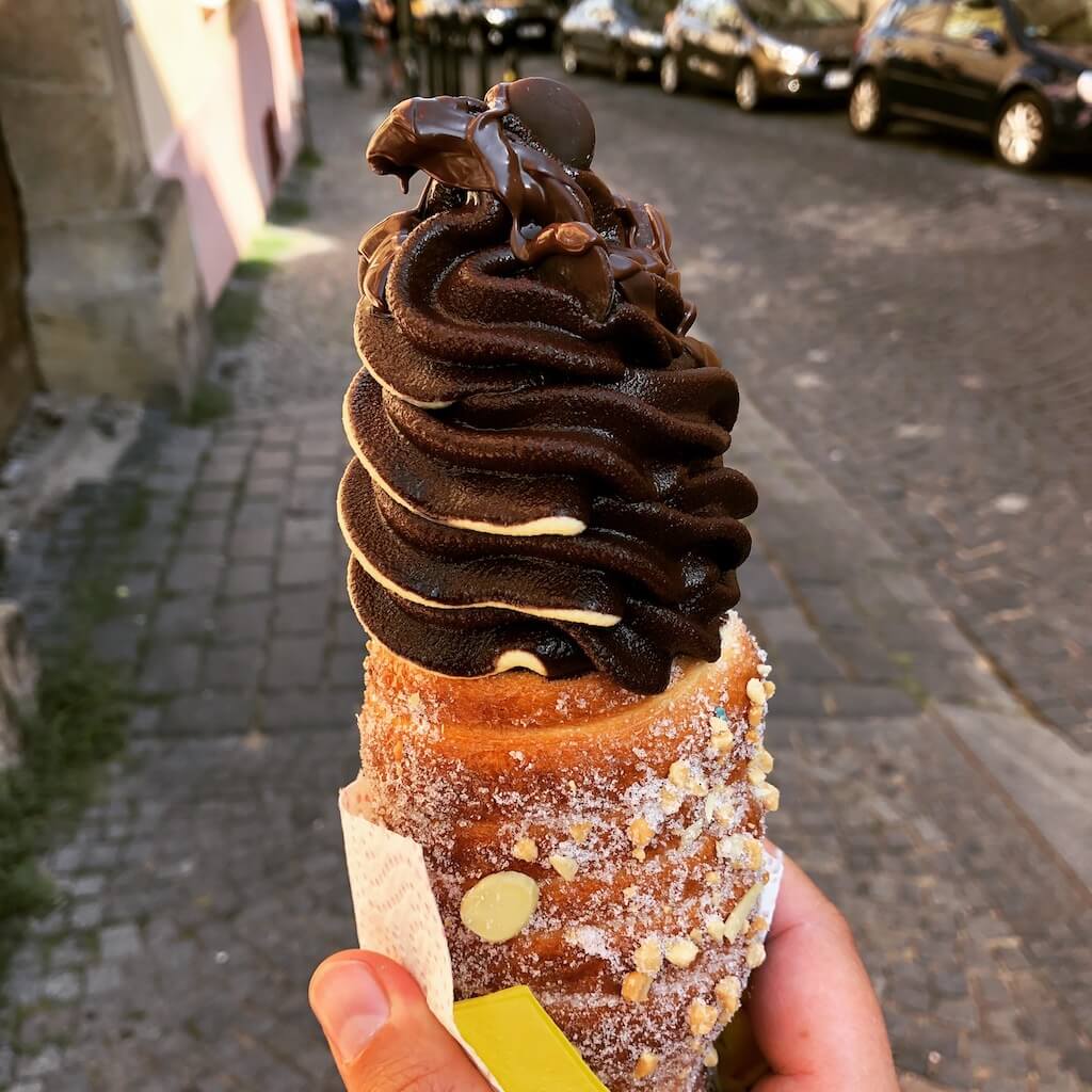 Das ist leichter gesagt als getan. In Prag wird überall deftiges Essen angeboten, und die größte Kalorienbombe war Softeis im luftig-leichten Striezelteig (Trdelnik). Mir ist schon lange nicht mehr von einer Mahlzeit schlecht geworden, aber dieses mega-leckere Eis hat es geschafft. Ich würde es trotzdem wieder essen … war zu gut.
