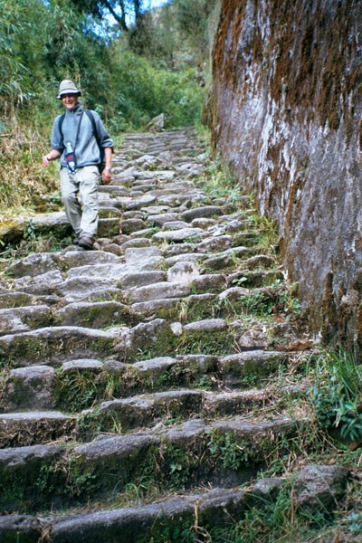 Doch ist der höchste Pass einmal erreicht, geht es wieder bergab auf 3.600 Meter. Dort gibt es Mittagessen. Noch eine Stunde später oder wieder 200 Meter höher wird dann das Nachtlager aufgeschlagen. Am dritten Tag heißt es nochmals Zähne zusammen beißen. 3.950 Meter liegt der zweithöchste Pass der Strecke über dem Meeresspiegel. Aber danach geht es nur noch abwärts: Zwei Stunden und danach noch 1.500 Stufen durch den Urwald. Die Stufen sind teilweise aus dem rohen Fels gehauen. Sie sind uneben, steil und nicht vergleichbar mit einer betonierten Treppe. Zum Ausgleich geht der Abstieg vorbei an exotischen Pflanzen in schrillen Farben. Kolibris stehen in der Luft und Schmetterlinge, doppelt so groß wie die kleinen Vögel, umschwirren die Wandernden. Es ist ein Paradies auf Erden.