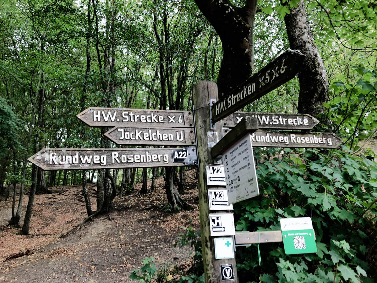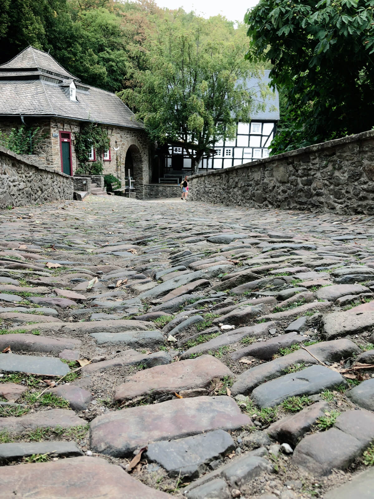 Nach dem Abendessen mit Tortelloni und viel Salat drehen wir darum noch eine Runde mit gut vier Kilometern rund um den Rosenberg. Dort sieht es aus, wie man sich den Märchenwald vorstellt: viel Grün. Moos auf längst umgefallenen Baumstämmen und Farne. Das Beste daran: Während der knappen Stunde, die wir bergauf und bergab gehen, treffen wir keinen einzigen anderen Spaziergänger. Erst kurz vor der Burg wird man in die Realität zurück geholt, denn von unten aus dem Dorf mit seinen hübschen Fachwerkhäusern schallt der nicht endende Lärm des Verkehrs auf der Durchgangsstraße herauf. Doch selbst das kann uns nach der vielen frischen Luft nicht um unseren Schlaf bringen.