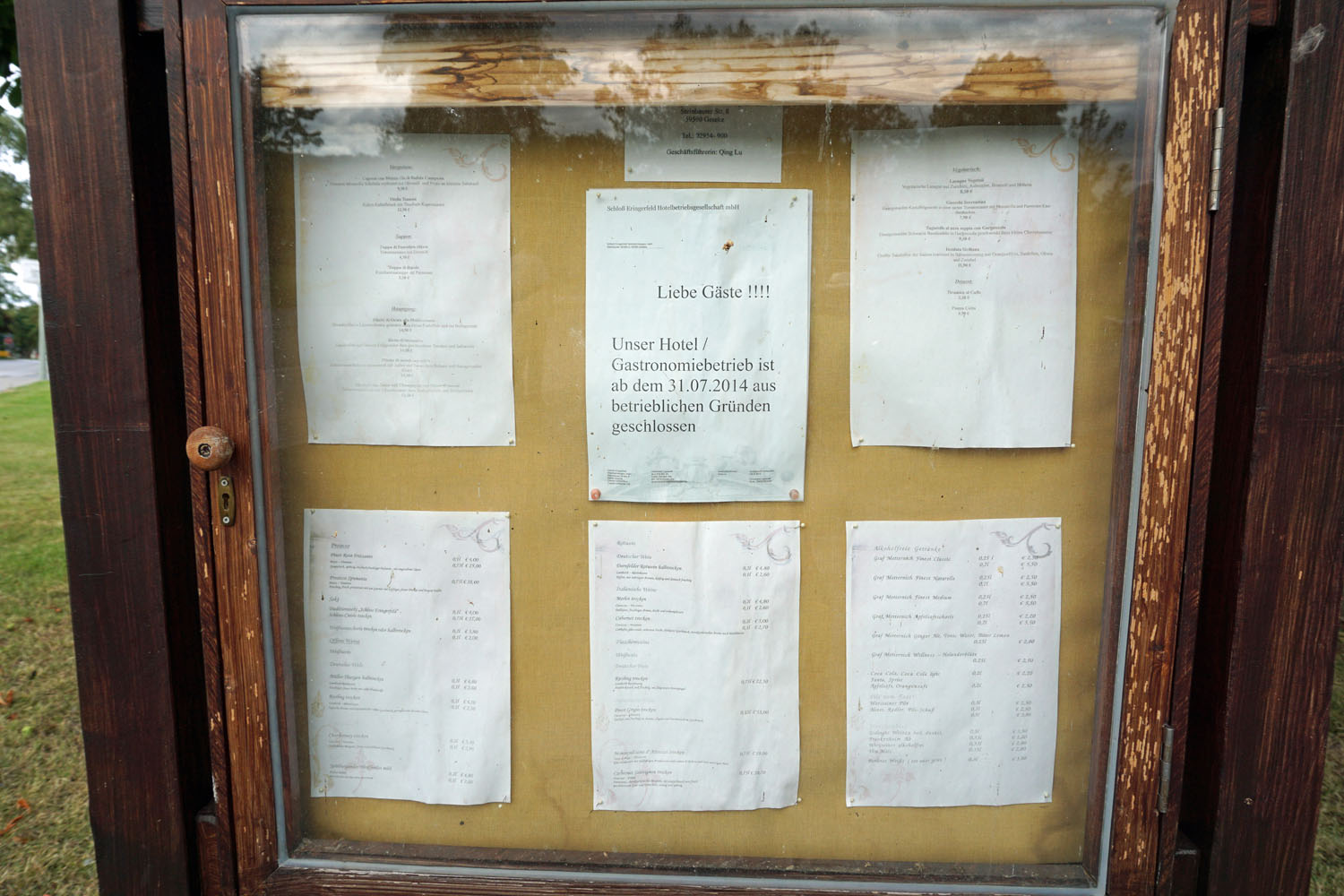 Gebaut wurde es ab 1678, bewohnt einst von Freiherren. 1961 wurde es zum Internat, verrät eine Informationstafel am Eingang, später war es Tagungszentrum mit Hotel. Seit Juli 2014 ist es aus „betrieblichen Gründen“ geschlossen, wie ein Zettel im Schaukasten verrät. Dort hängt auch noch die verblichene Speisekarte. Ein chinesischer Name in Geseke, die Stadt zu der Eringerfeld gehört, wird als Inhaber genannt. Meine Nachfrage bei der dortigen Verwaltung ergibt: Das Schloss soll nicht verfallen, im Gegenteil gäbe es Pläne, daraus wieder ein Hotel zu machen. Die Bauarbeiten haben schon angefangen, heißt es. Das passt zu dem verstreut liegenden Werkzeug an diesem Samstagmorgen. Allerdings sieht es bisher nicht so aus, als ob viel passiert wäre. Hoffentlich ändert sich das bald. Nicht, dass doch noch eine Dornröschenhecke rund um Schloss Eringerfeld beginnt zu sprießen.