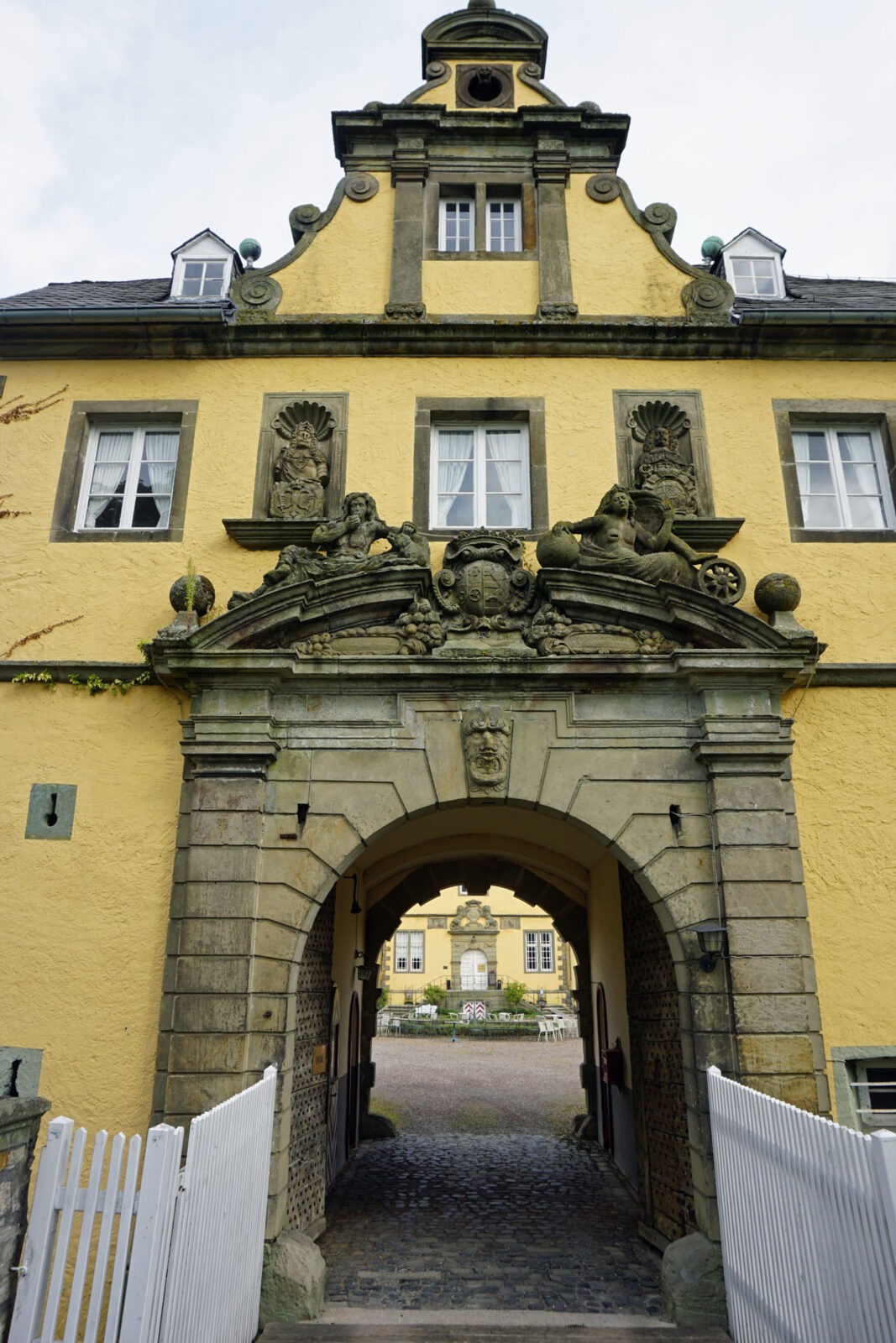 Wie das Schloss aus einem Märchen steht es da, satt gelb gestrichen, mit steinernen Ornamenten. Und doch sehr verwaist. Das Holztor steht weit offen, im Innenhof Stühle und Tische, als ob die Besucher gerade erst gegangen wären. Hier und da fehlen Glasscheiben, man wittert den Verfall eines einst bezaubernden Ortes, doch dann entdeckt man Spuren von Arbeit: Schubkarren stehen ganz hinten im Hof, ein Bauschuttrohr hängt aus einem der oberen Fenster. Nur Menschen sehe ich weit und breit keine. Das ist das Barockschloss Eringerfeld im Sommer 2016, mitten in NRW.