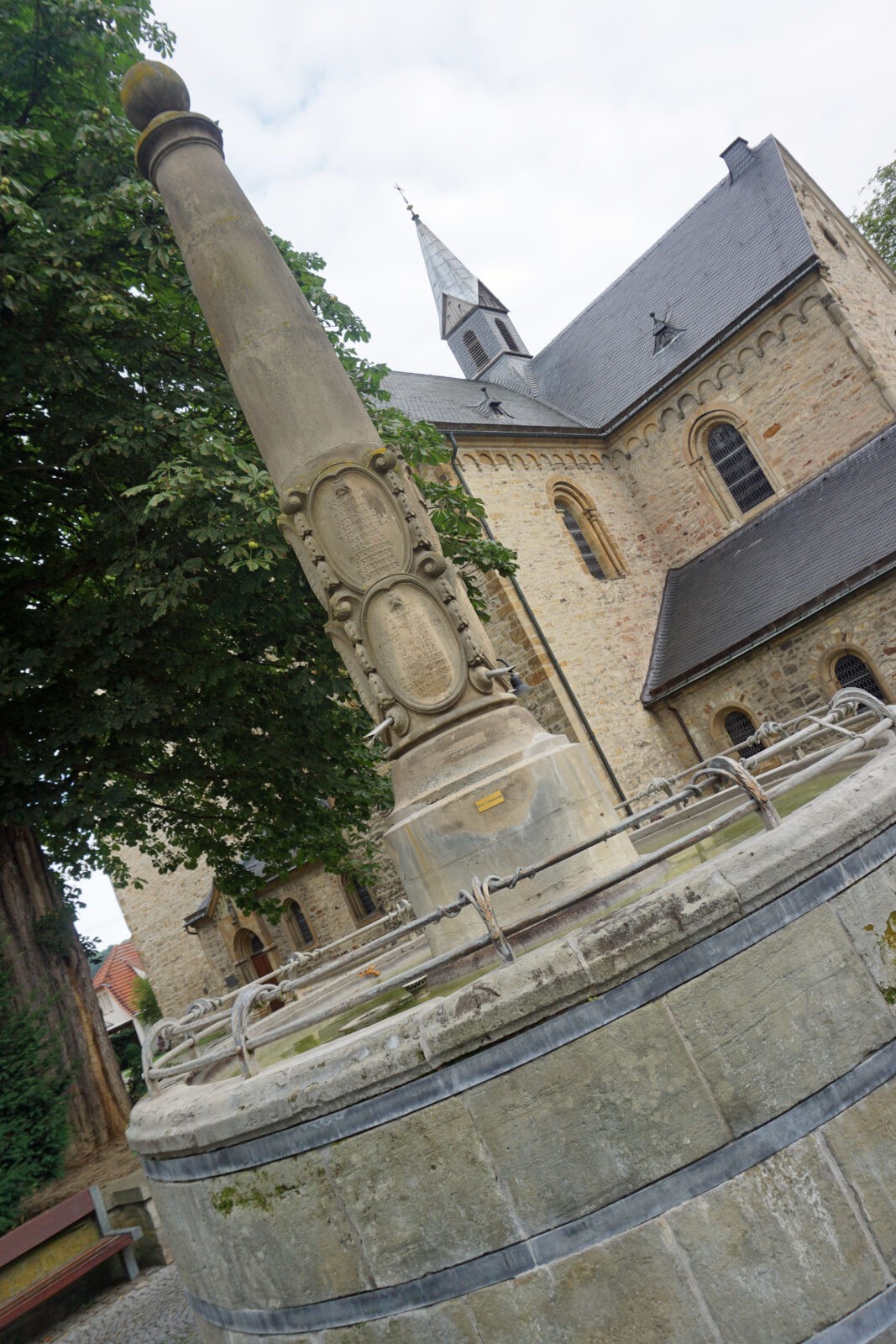 Wenn man dann an der Sparkasse die Straßenseite wechselt und ein Stück den Berg hinauf geht, kommt man bald an eine Straße, an deren Ende noch einer der alten Stadttürme steht. An ihm geht man links vorbei, und am Ende der Straße wieder links – vorbei am Mahnmal für die Synagoge und am Brunnen bis zur Nikolauskirche. Als ich dort vorbeikomme, höre ich drinnen die Messebesucher singen.