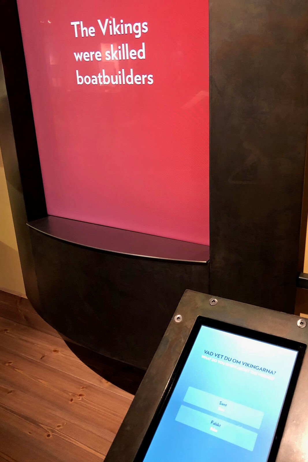 Der Mythos um die Hörner komme aus der Geschichte, erzählt der junge Mann weiter. So habe Richard Wagner beispielsweise im Ring der Nibelungen Krieger mit sehr großen Hörnern gezeigt, damit auch den Zuschauer*innen in der letzten Reihe klar wurde, wer gut und wer böse ist. Auch von kämpfenden Frauen weiß er zu berichten, die Krieger*innen anführten, eine sehr emanzipierte Gesellschaft scheint das damals in Skandinavien gewesen zu sein. So, wie es heute noch immer ist. Im Museum können sich Besucher*innen außerdem an den Bildschirmen darüber informieren, wie das Leben der Kämpfer*innen früher aussah, und welche Rolle Sklav*innen bei den Wikingern spielten. In den kurzen Videobeiträgen erfährt man zu diesen und anderen Themen viel auf Schwedisch mit englischen Untertiteln, und am Ende kann man sein Wissen bei einem Quiz beweisen.