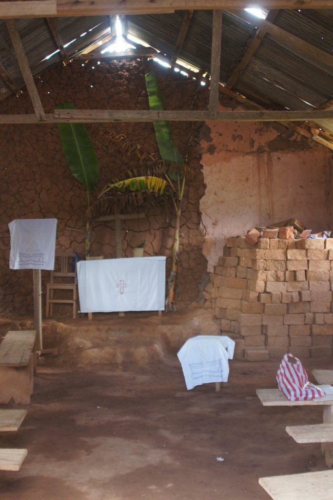 Rechts vorne liegen Lehmziegelsteine für die neue Kirche. Deren Grundriss ist schon in Beton gegossen. Doch die künftigen Innenräume sind hüfthoch mit Busch und Gras bewachsen, weil das Geld zum Bau fehlt. Bis genügend Geld da ist, werden die bereits gekauften Steine in der alten Kirche aufbewahrt. In den sechs rechten Bänken in der Kirche sitzen drei Männer und zwei Kinder, die linken Bänke sind mit Frauen und noch mehr Kindern dicht besetzt. Der Kirchenchor sitzt vorne, seine Besetzung variiert: Einige Mitglieder gehen früher, andere kommen später, die Frau in der ersten Reihe singt fleißig mit, während sie ihrem Kind die Brust gibt. In der zweiten Reihe steht die auffallend gut gekleidete Vorsingerin: langer blauer Rock, Schal in der gleichen Farbe, geblümte Bluse. Ihre Haare stehen am Hinterkopf wie ein aerodynamischer Flugzeugflügel ab. Ein Lied kenne ich aus der deutschen Kirche, mir fällt der Text nicht ein, aber eine Zeile lautet „lasset den Lobgesang hören!“. Auch das Vater unser meine ich zu erkennen.