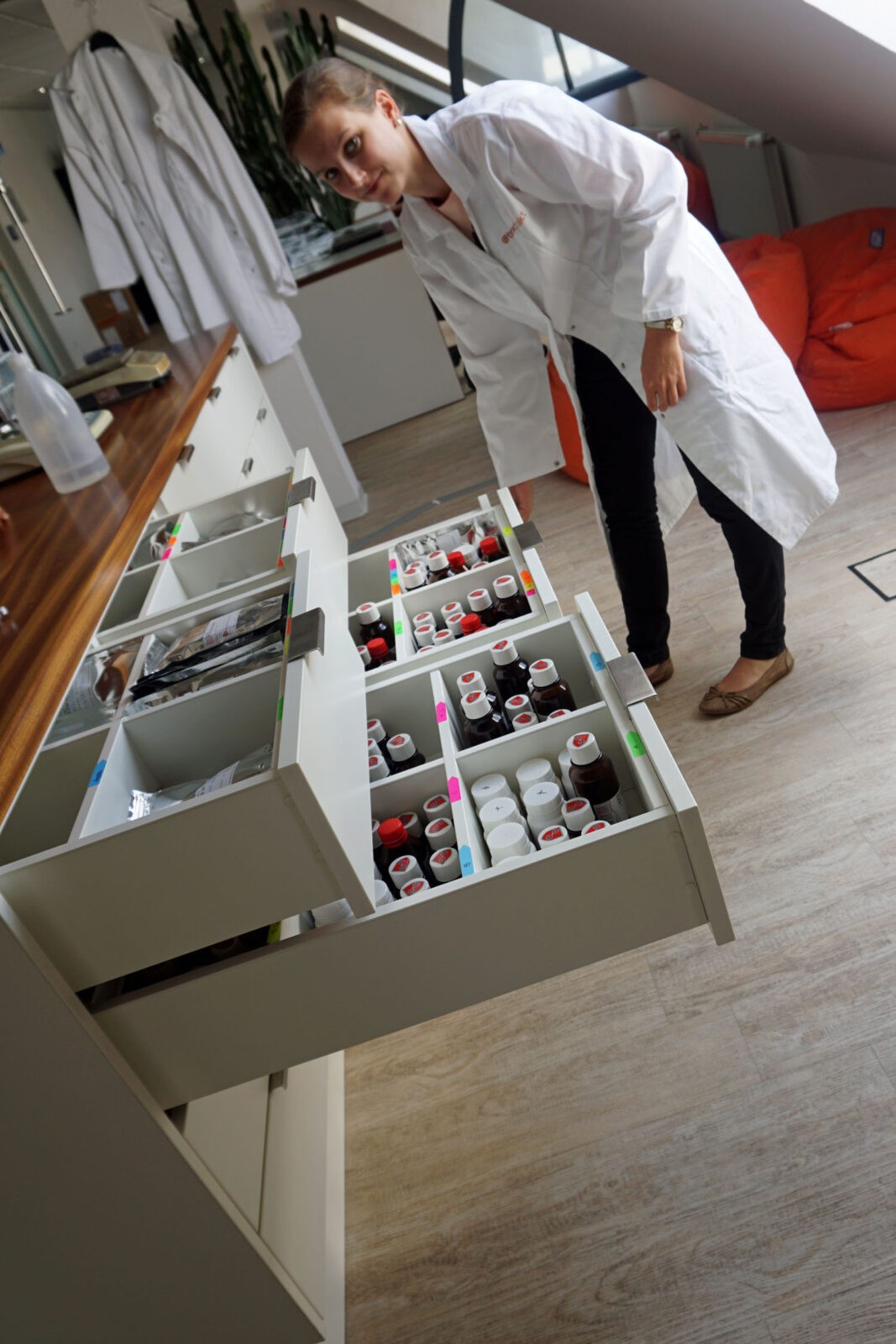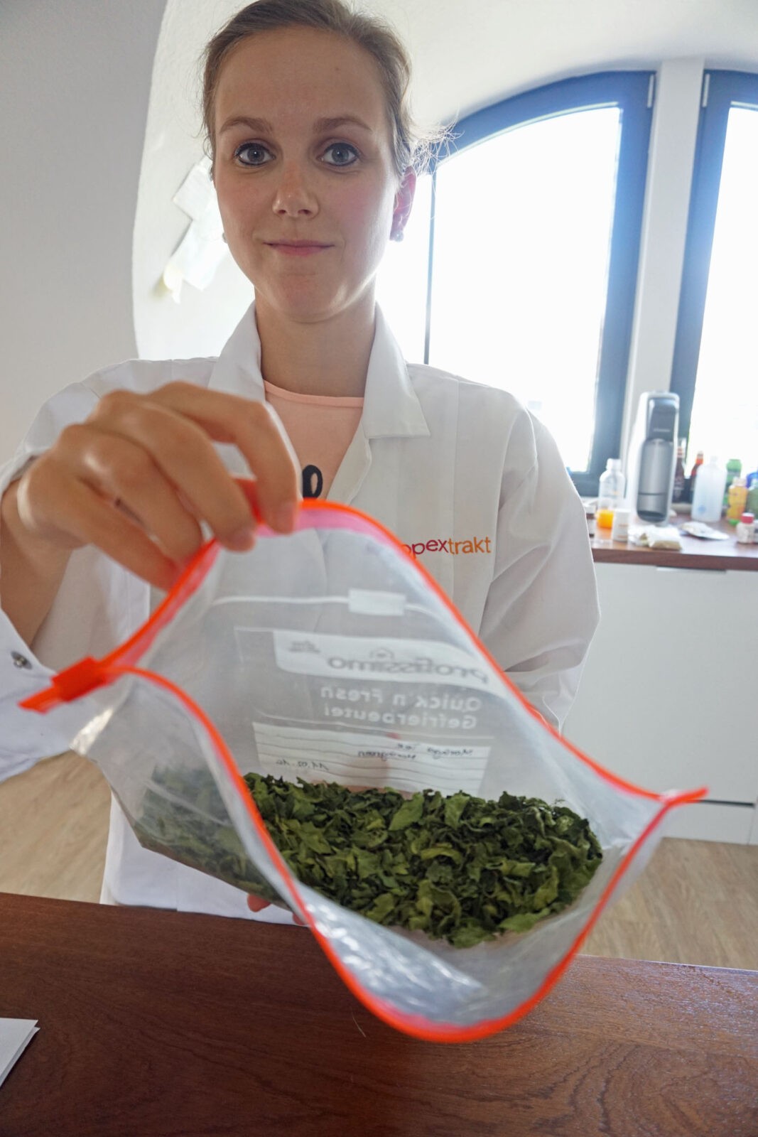 Kokosblütensirup, etwas Ingwer, Pfeffer, Moringa-Tee – Lisa Kilian mischt Zutaten in einem kleinen Labor im Frankfurter Osten. Heraus kommt ein Saft, den ein Kunde bei ihrem Arbeitgeber Tropextrakt in Auftrag gegeben hat. „Das ist die vierte Bemusterung“, sagt die studierte Lebensmitteltechnologin. „Der Kunde wünschte mehr Schärfe.“ Mehr Schärfe, weniger Süße, etwas mehr Rot – manchmal dauert es ein bisschen, bis man genau das getroffen hat, was sich der Kunde vorstellt. „Darum ist es wichtig, dass man gut zuhört “, sagt Lisa Kilian. Schon zu Beginn gibt es nämlich mit jedem Kunden ein sehr ausführliches Gespräch. In der Regel experimentiert Lisa Kilian dann einen halben Tag im Labor – und ist oft schon sehr nah am gewünschten Geschmack.