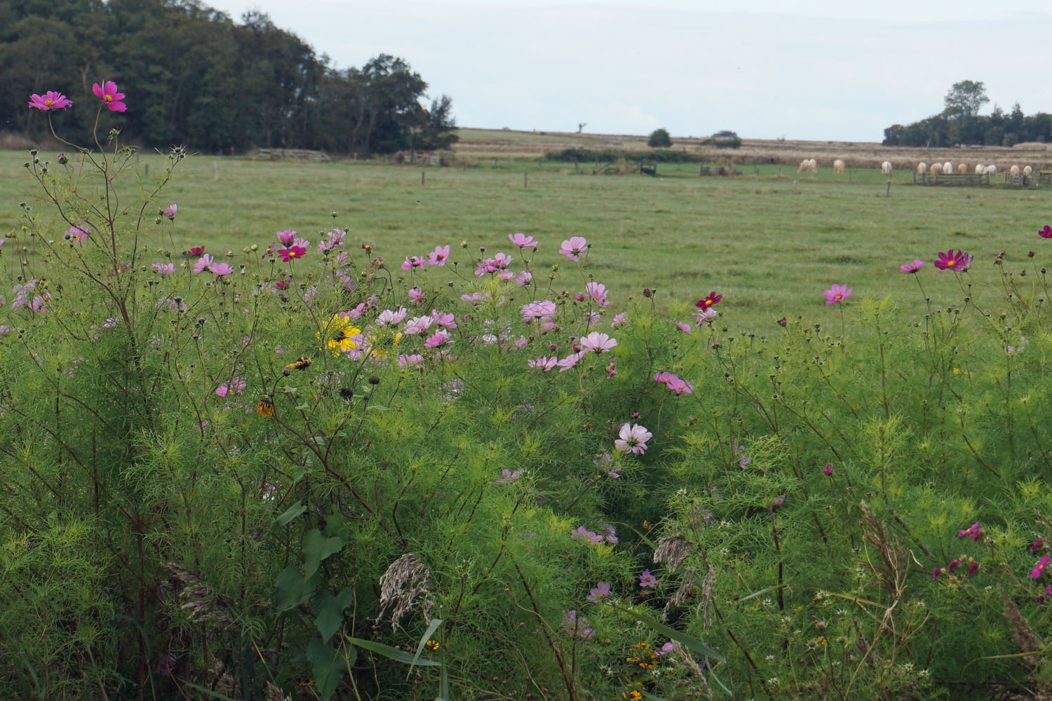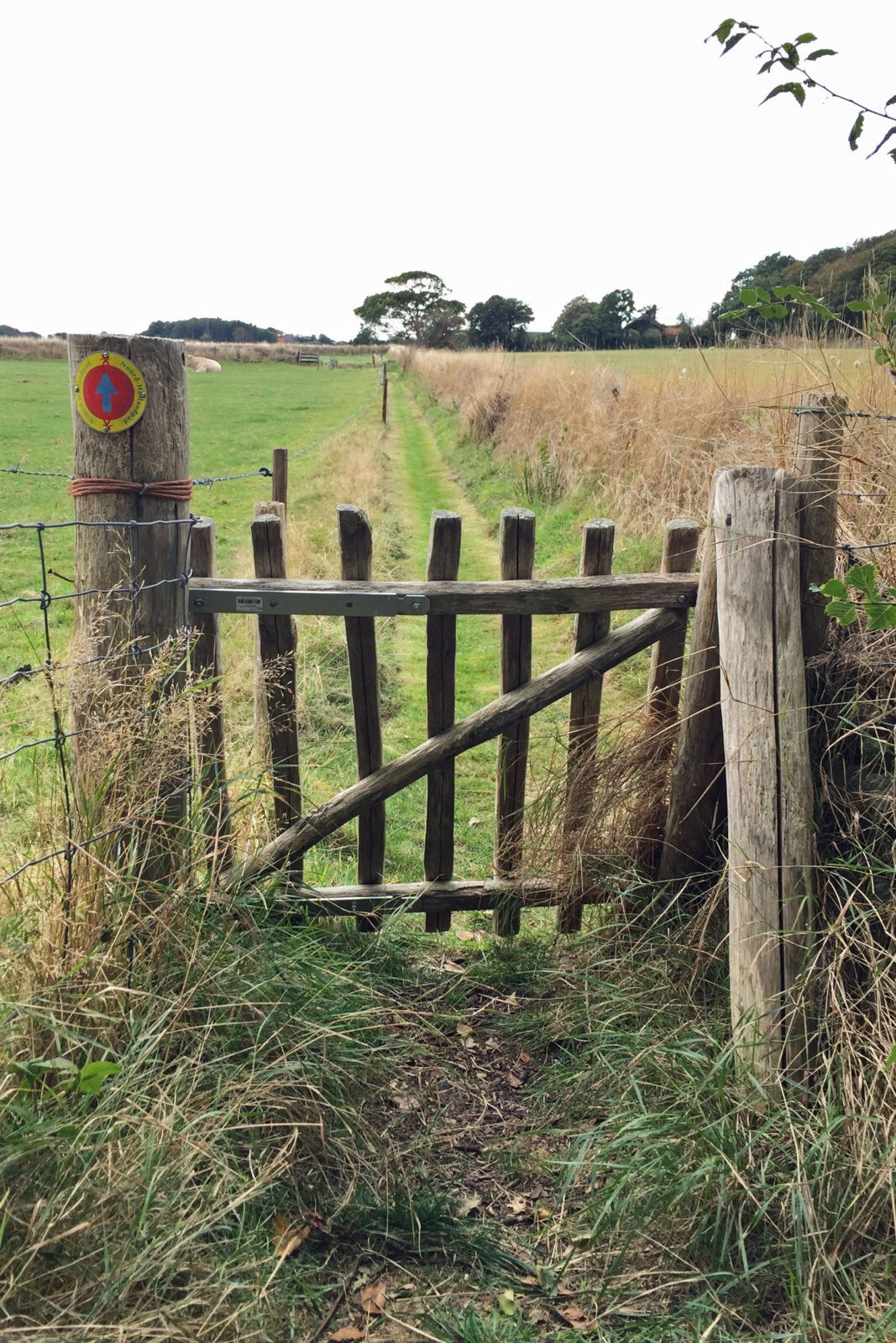 Irgendwann sieht man rechts zwischen den Häusern eine Kirche, das ist jedoch nicht die, die in der Beschreibung genannt wird. Stattdessen muss man noch etwas weiter geradeaus gehen, und von dort findet sich der Weg eigentlich von alleine: Durch Wiesen, vor einem Wäldchen links, rechts am Hof vorbei. Verlaufen kann man sich kaum, weil man immer auf einem schmalen Weg zwischen Gattern hindurchgeht und dabei unzählige Holztörchen öffnet und hinter sich wieder schließt. Man kommt vorbei an Kühen und Schafen, und ich bin froh, dass keines auf dem Rücken liegt. Denn sollte das der Fall sein, muss man ihm auf die Beine helfen, weil es sonst stirbt. Das wurde uns in unserer kurzen Zeit auf Texel gleich mehrmals eingeschärft.