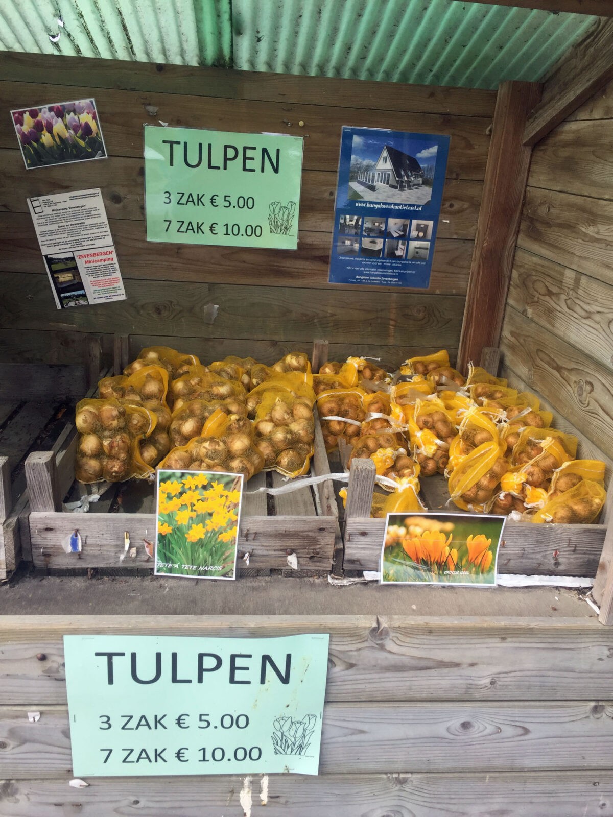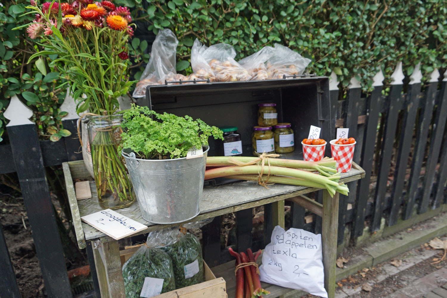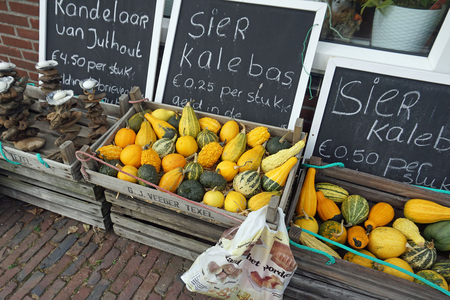 Der schwierigste Teil unserer Wanderung auf der Nordseeinsel Texel ist, den Einstieg zu finden. Der ist nämlich bei der so genannten VOC-Route bei einer Kirche, und die müssen wir, vom Hafen in Oudeschild kommend, erst einmal finden. Von dort gehen wir über die Treppe und vorbei am Seeleute- und Strandräuber-Museum Kaap Skil. Wir halten uns links und gehen dann rechts einen schmalen Weg, parallel zum Damm immer geradeaus. Vorbei an vielen kleinen Häuschen, die vor der Eingangstür Marmelade verkaufen, Kartoffeln oder Blumenzwiebeln. Wer etwas mitnehmen möchte, wirft einfach den angeschriebenen Preis in eine kleine Schachtel und packt es ein. Wir kaufen Krokus- und Narzissenzwiebeln für den Balkon.
