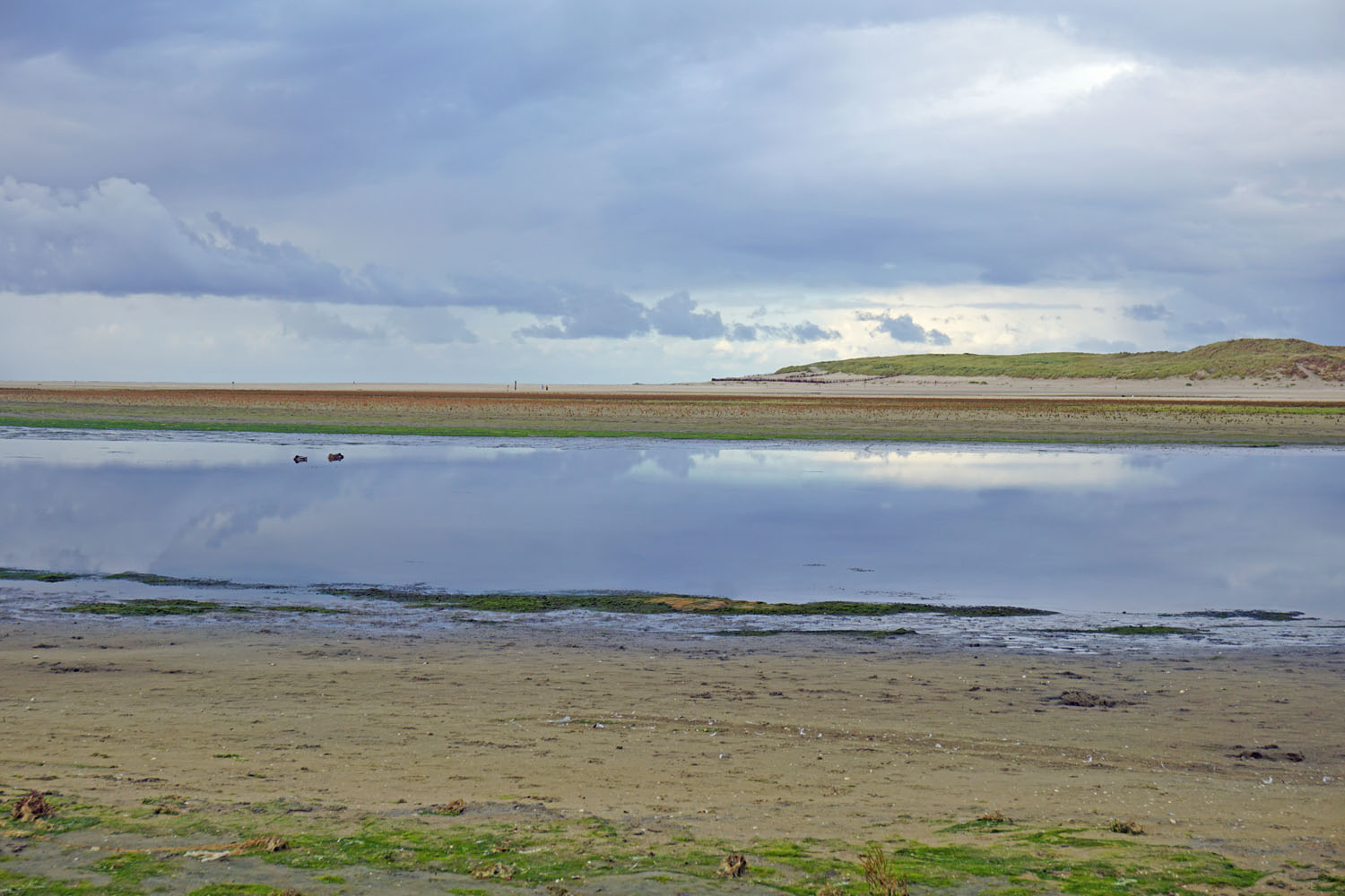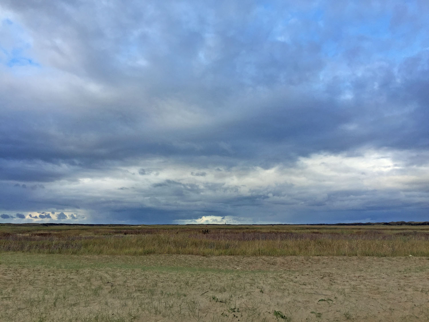Zurück auf dem Weg geht es immer nur noch geradeaus bis Den Burg. Am Groeneplaats, vor dem Hotel De Lindeboom rufen wir den Texelhopper, der uns bis zur Station De Slufter bringt. Dort, hinter dem Damm, erstreckt sich ein Naturschutzgebiet mit Wanderdünen, das ein- bis zweimal im Jahr überflutet ist. Ein Weg führt hier an einem See vorbei bis zum Meer. Auf dem Rückweg nehmen wir einen anderen Weg und sind überrascht, dass wir an einem ganz anderen Übergang herauskommen, als gedacht. Macht aber nichts, wir sind schließlich in Urlaub. Eine gute Stunde ist man hin und zurück unterwegs, denn zum Meer sind es etwa zwei Kilometer, die man teilweise durch den Sand stapft.