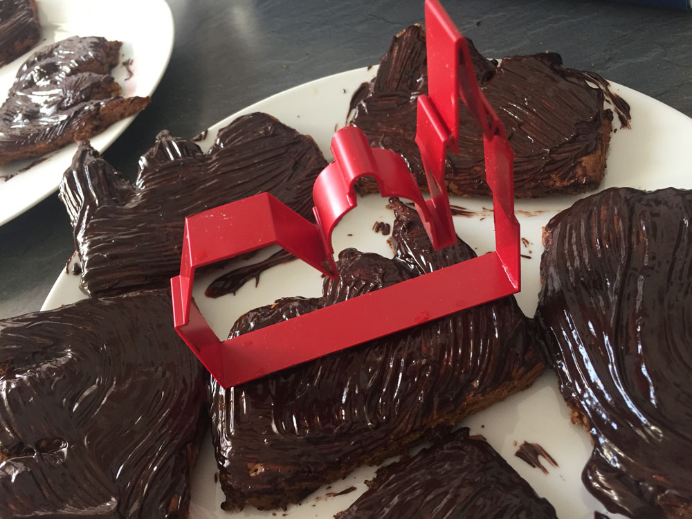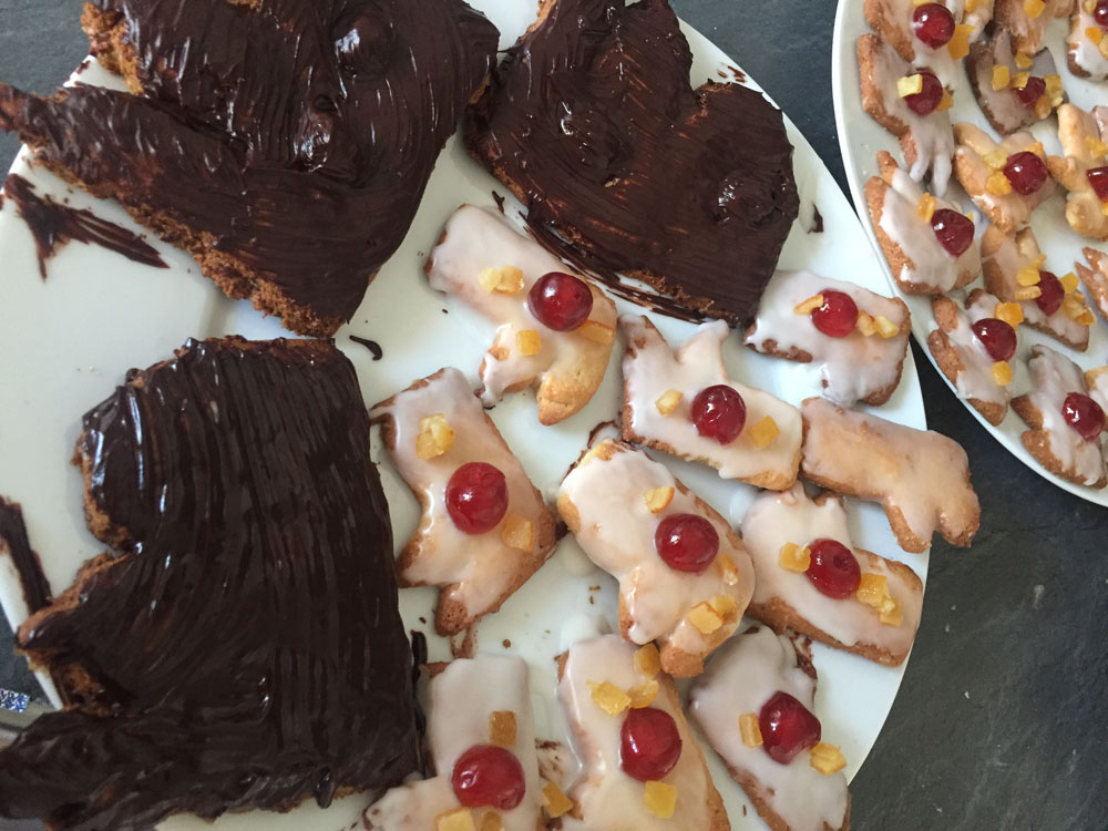 Das fertige Gebäck habe ich mit geschmolzener Schokolade bestrichen. Es ist unfassbar lecker geworden, am Rand aber leider sehr hart. Weil ich auch eine Kölner Domausstechform habe – natürlich – habe ich gleich auch noch Orangenplätzchen gebacken. Im Gegensatz zum Printenteig wurde dieser Teig so weich, dass ich ihn selbst nach 30 Minuten im Kühlschrank nicht vernünftig ausstechen konnte. Ich habe ihn dann ins Gefrierfach gelegt. Das Ergebnis ist ebenfalls lecker. Das war’s jetzt aber auch mit meiner Weihnachtsbäckerei für 2015. Denn ich bin, auch wenn’s nicht so scheint, tatsächlich ein Weihnachtsmuffel. Aber Printen, Lebkuchen und Dominosteine – das geht immer.